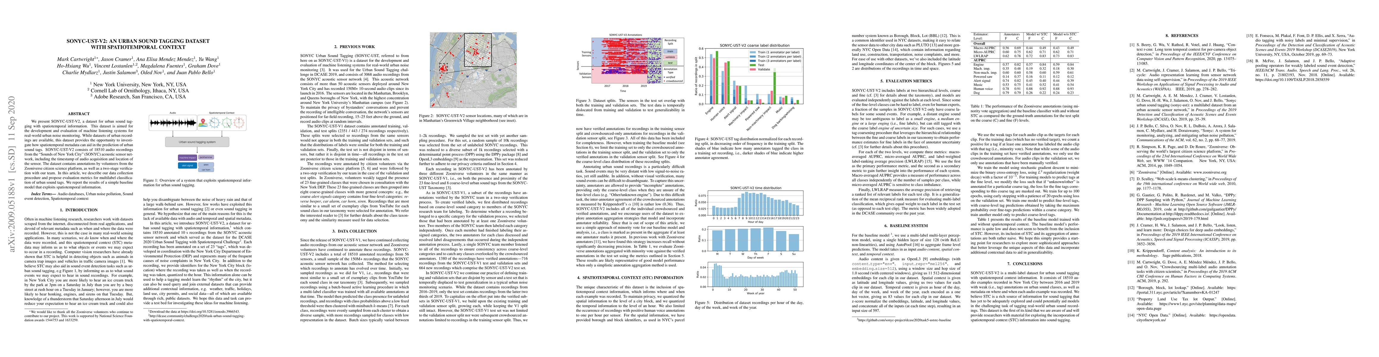 SONYC-UST-V2 is a dataset for urban sound tagging enriched with spatiotemporal metadata, aimed at advancing machine listening systems for urban noise monitoring. The dataset includes 18,510 audio recordings from New York City, with annotations and verification from volunteers and experts, and proposes evaluation metrics for multilabel classification.