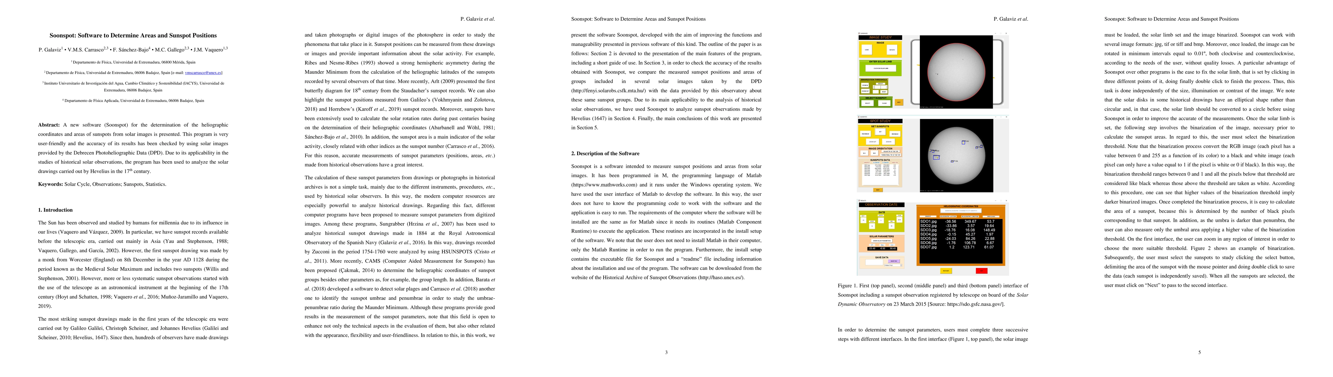 A new software (Soonspot) for the determination of the heliographic coordinates and areas of sunspots from solar images is presented. This program is very user-friendly and the accuracy of its results has been checked by using solar images provided by the Debrecen Photoheliographic Data (DPD). Due to its applicability in the studies of historical solar observations, the program has been used to analyze the solar drawings carried out by Hevelius in the 17th century.