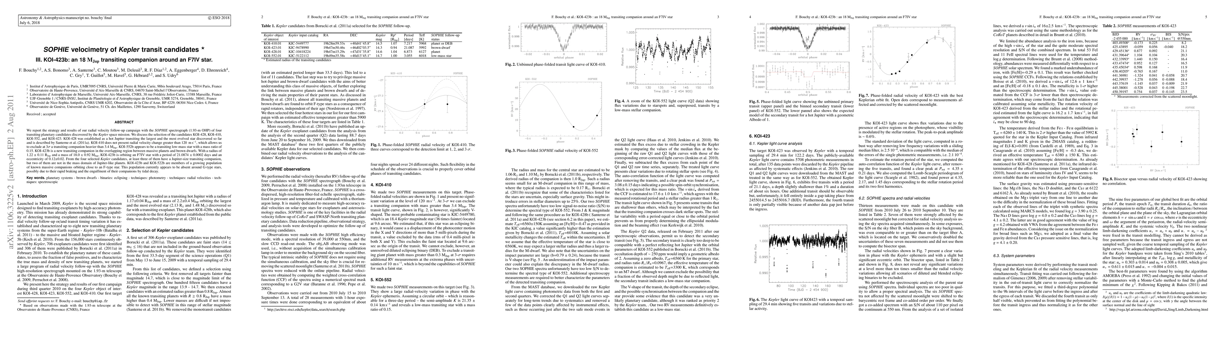 This paper reports the discovery of KOI-423b, an 18 Mjup transiting companion around an F7IV star, using SOPHIE velocimetry. Among four Kepler candidates, KOI-423b is identified as a massive planet-brown dwarf hybrid, while the others show no significant radial velocity changes or are low-mass stars.