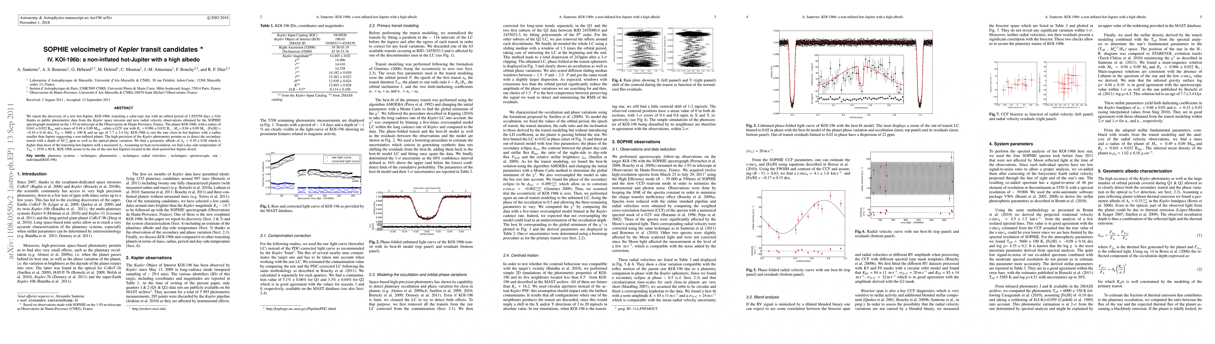 KOI-196b, a non-inflated hot-Jupiter discovered via SOPHIE velocimetry, transits a solar-type star with a high geometric albedo of 0.30±0.08, indicating it reflects more light than typical hot-Jupiters. This planet resides in the short-period hot-Jupiter desert.