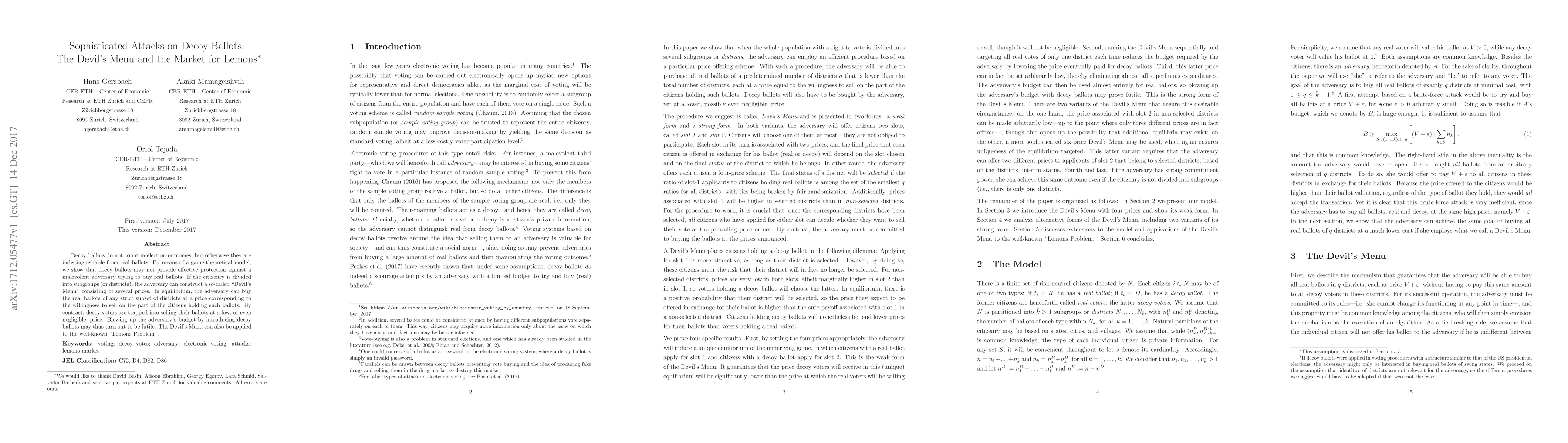 Decoy ballots do not count in election outcomes, but otherwise they are indistinguishable from real ballots. By means of a game-theoretical model, we show that decoy ballots may not provide effective protection against a malevolent adversary trying to buy real ballots. If the citizenry is divided into subgroups (or districts), the adversary can construct a so-called "Devil's Menu" consisting of several prices. In equilibrium, the adversary can buy the real ballots of any strict subset of districts at a price corresponding to the willingness to sell on the part of the citizens holding such ballots. By contrast, decoy voters are trapped into selling their ballots at a low, or even negligible, price. Blowing up the adversary's budget by introducing decoy ballots may thus turn out to be futile. The Devil's Menu can also be applied to the well-known "Lemons Problem".