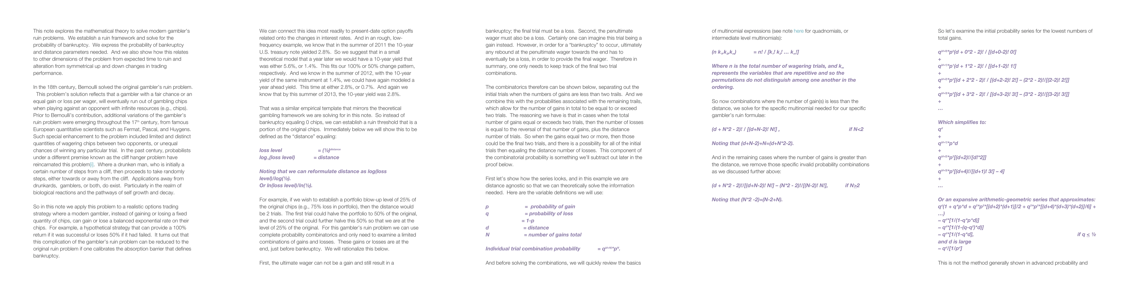 This note explores the mathematical theory to solve modern gamblers ruin problems. We establish a ruin framework and solve for the probability of bankruptcy. We also show how this relates to the expected time to bankruptcy and review the risk neutral probabilities associated an adjustment to asymmetrical views.