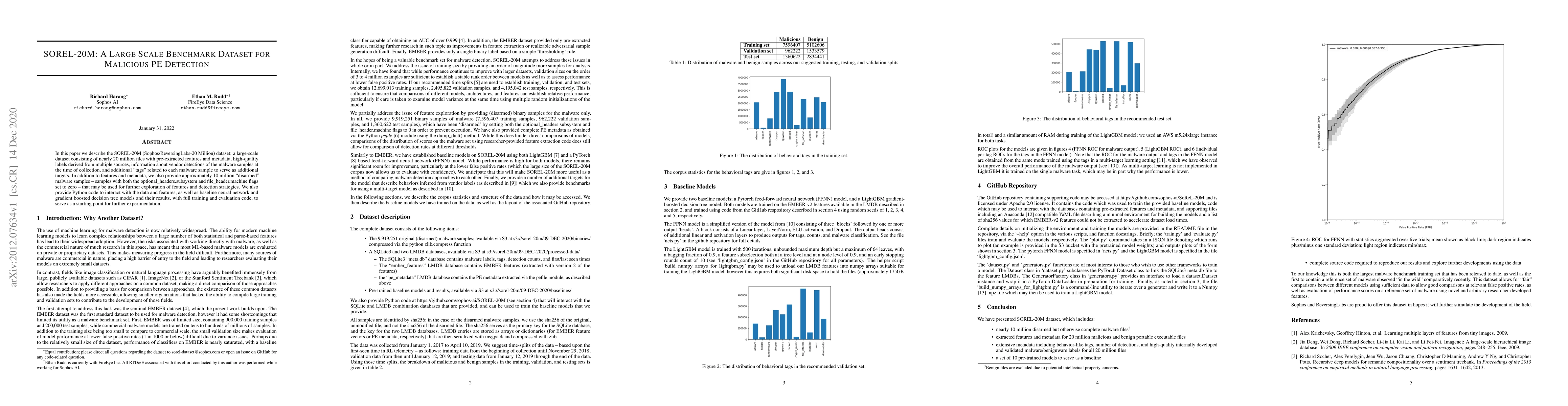 In this paper we describe the SOREL-20M (Sophos/ReversingLabs-20 Million) dataset: a large-scale dataset consisting of nearly 20 million files with pre-extracted features and metadata, high-quality labels derived from multiple sources, information about vendor detections of the malware samples at the time of collection, and additional ``tags'' related to each malware sample to serve as additional targets. In addition to features and metadata, we also provide approximately 10 million ``disarmed'' malware samples -- samples with both the optional\_headers.subsystem and file\_header.machine flags set to zero -- that may be used for further exploration of features and detection strategies. We also provide Python code to interact with the data and features, as well as baseline neural network and gradient boosted decision tree models and their results, with full training and evaluation code, to serve as a starting point for further experimentation.