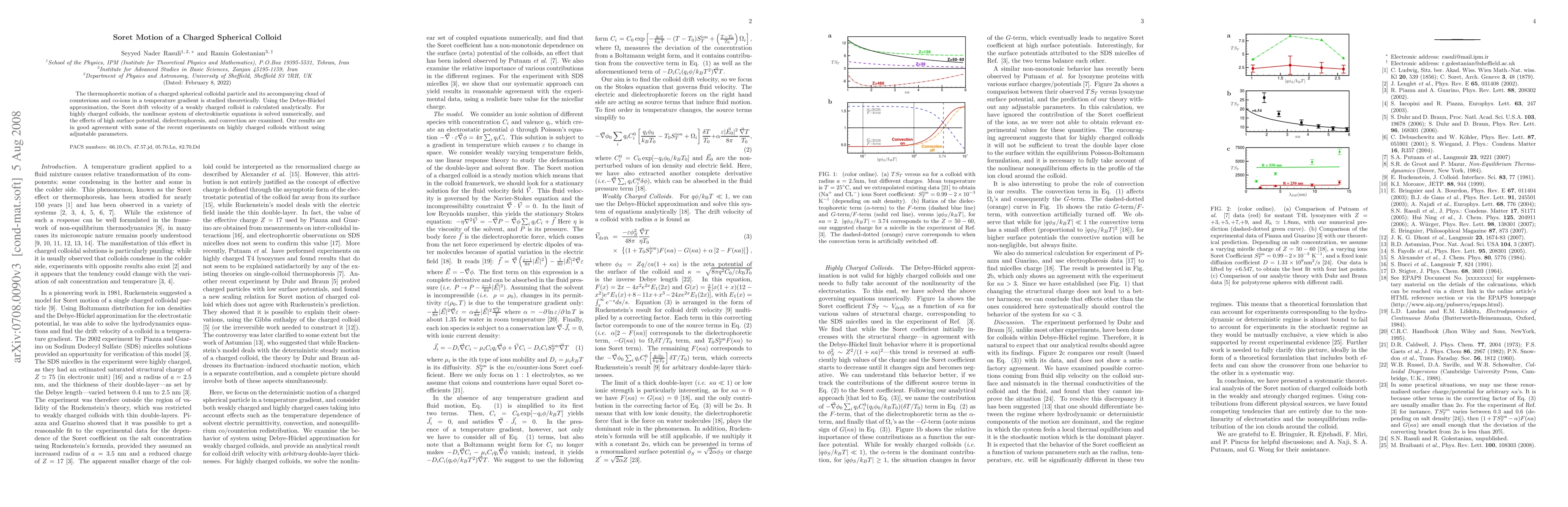 The thermophoretic motion of a charged spherical colloidal particle and its accompanying cloud of counterions and co-ions in a temperature gradient is studied theoretically. Using the Debye-Huckel approximation, the Soret drift velocity of a weakly charged colloid is calculated analytically. For highly charged colloids, the nonlinear system of electrokinetic equations is solved numerically, and the effects of high surface potential, dielectrophoresis, and convection are examined. Our results are in good agreement with some of the recent experiments on highly charged colloids without using adjustable parameters.