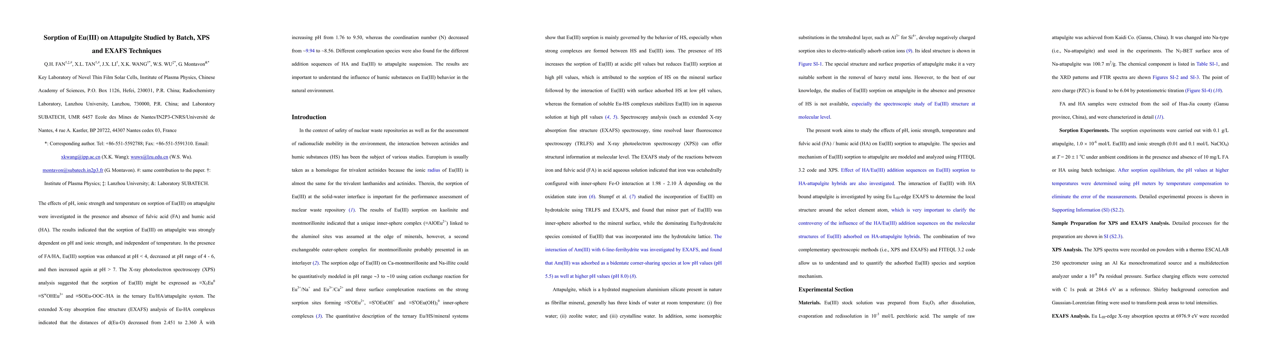 The effects of pH, ionic strength and temperature on sorption of Eu(III) on attapulgite were investigated in the presence and absence of fulvic acid (FA) and humic acid (HA). The results indicated that the sorption of Eu(III) on attapulgite was strongly dependent on pH and ionic strength, and independent of temperature. In the presence of FA/HA, Eu(III) sorption was enhanced at pH < 4, decreased at pH range of 4 - 6, and then increased again at pH > 7. The X-ray photoelectron spectroscopy (XPS) analysis suggested that the sorption of Eu(III) might be expressed as ?X3Eu0 ?SwOHEu3+ and ?SOEu-OOC-/HA in the ternary Eu/HA/attapulgite system. The extended X-ray absorption fine structure (EXAFS) analysis of Eu-HA complexes indicated that the distances of d(Eu-O) decreased from 2.451 to 2.360 {\AA} with increasing pH from 1.76 to 9.50, whereas the coordination number (N) decreased from ~9.94 to ~8.56. Different complexation species were also found for the different addition sequences of HA and Eu(III) to attapulgite suspension. The results are important to understand the influence of humic substances on Eu(III) behavior in the natural environment.
