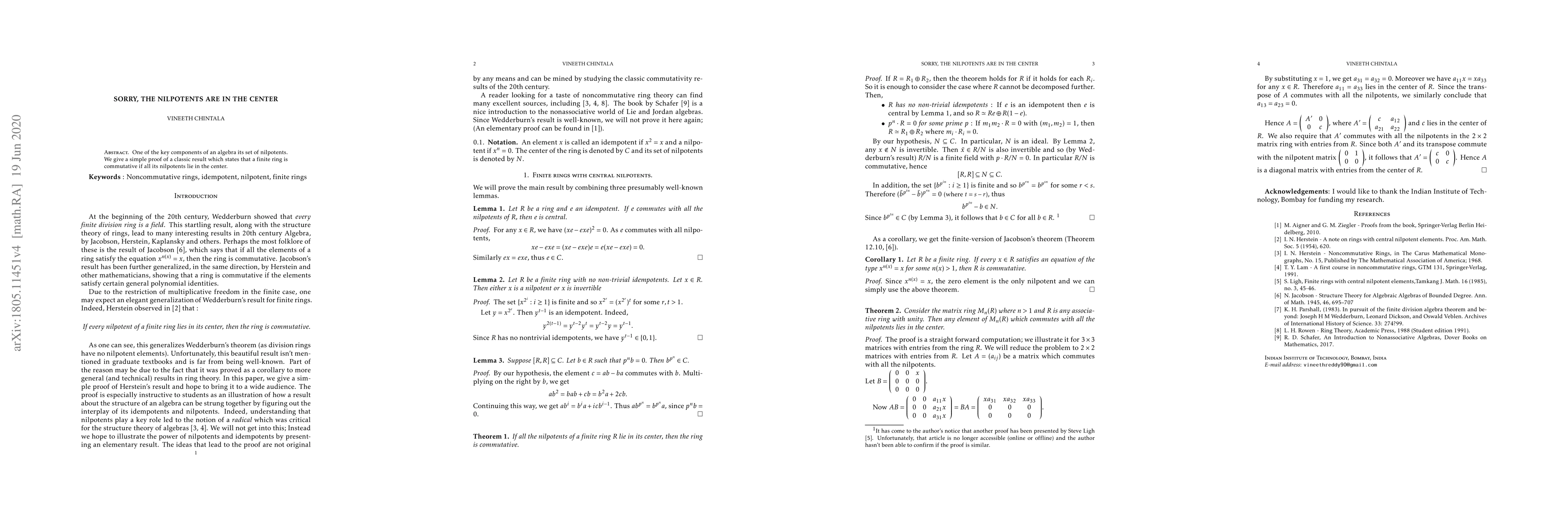 The behavior of nilpotents can reveal valuable information about the algebra. We give a simple proof of a classic result that a finite ring is commutative if all its nilpotents lie in the center.