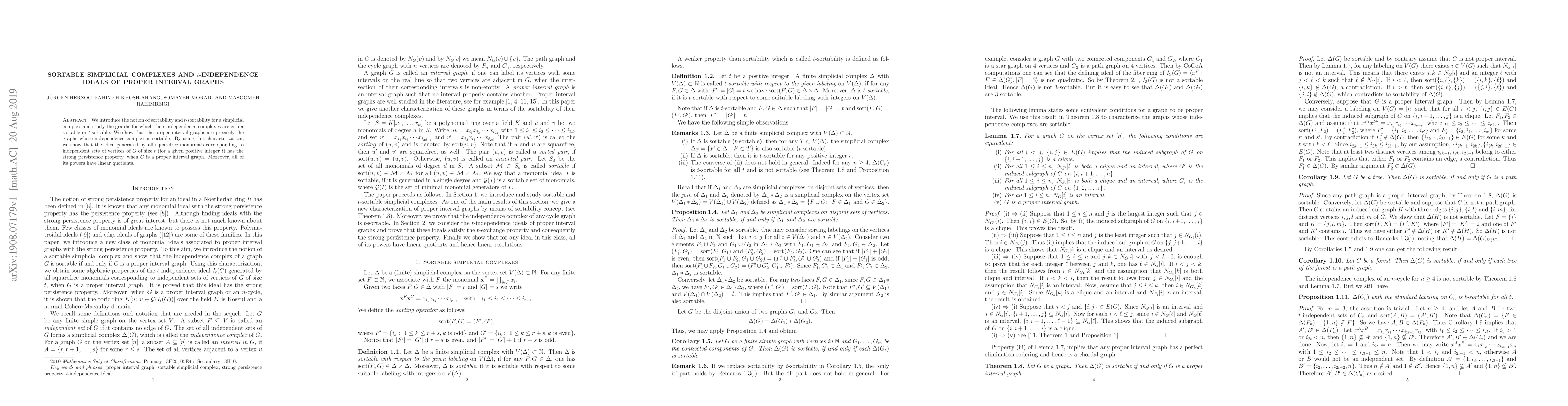 This paper introduces the concepts of sortability and $t$-sortability for simplicial complexes and identifies proper interval graphs as those whose independence complexes are sortable. It demonstrates that the $t$-independence ideals of these graphs possess strong persistence properties and linear quotients for all their powers.