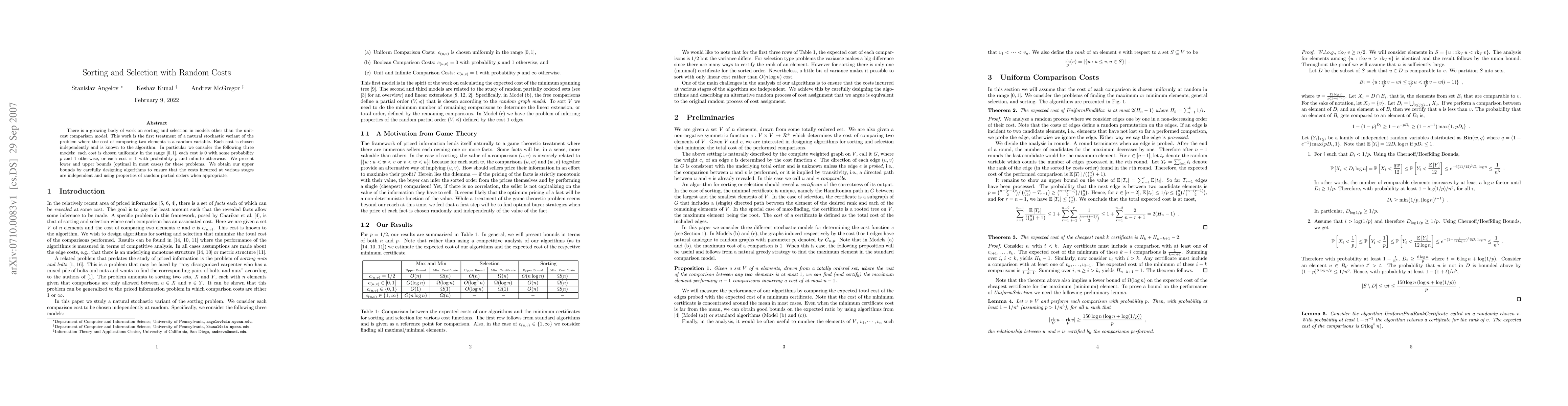 There is a growing body of work on sorting and selection in models other than the unit-cost comparison model. This work is the first treatment of a natural stochastic variant of the problem where the cost of comparing two elements is a random variable. Each cost is chosen independently and is known to the algorithm. In particular we consider the following three models: each cost is chosen uniformly in the range $[0,1]$, each cost is 0 with some probability $p$ and 1 otherwise, or each cost is 1 with probability $p$ and infinite otherwise. We present lower and upper bounds (optimal in most cases) for these problems. We obtain our upper bounds by carefully designing algorithms to ensure that the costs incurred at various stages are independent and using properties of random partial orders when appropriate.