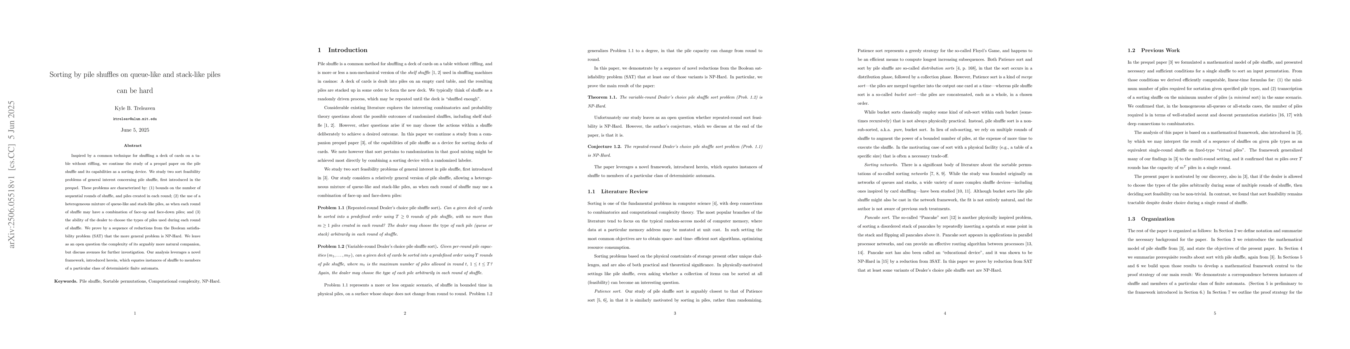 Inspired by a common technique for shuffling a deck of cards on a table without riffling, we continue the study of a prequel paper on the pile shuffle and its capabilities as a sorting device. We study two sort feasibility problems of general interest concerning pile shuffle, first introduced in the prequel. These problems are characterized by: (1) bounds on the number of sequential rounds of shuffle, and piles created in each round; (2) the use of a heterogeneous mixture of queue-like and stack-like piles, as when each round of shuffle may have a combination of face-up and face-down piles; and (3) the ability of the dealer to choose the types of piles used during each round of shuffle. We prove by a sequence of reductions from the Boolean satisfiability problem (SAT) that the more general problem is NP-Hard. We leave as an open question the complexity of its arguably more natural companion, but discuss avenues for further investigation. Our analysis leverages a novel framework, introduced herein, which equates instances of shuffle to members of a particular class of deterministic finite automata.