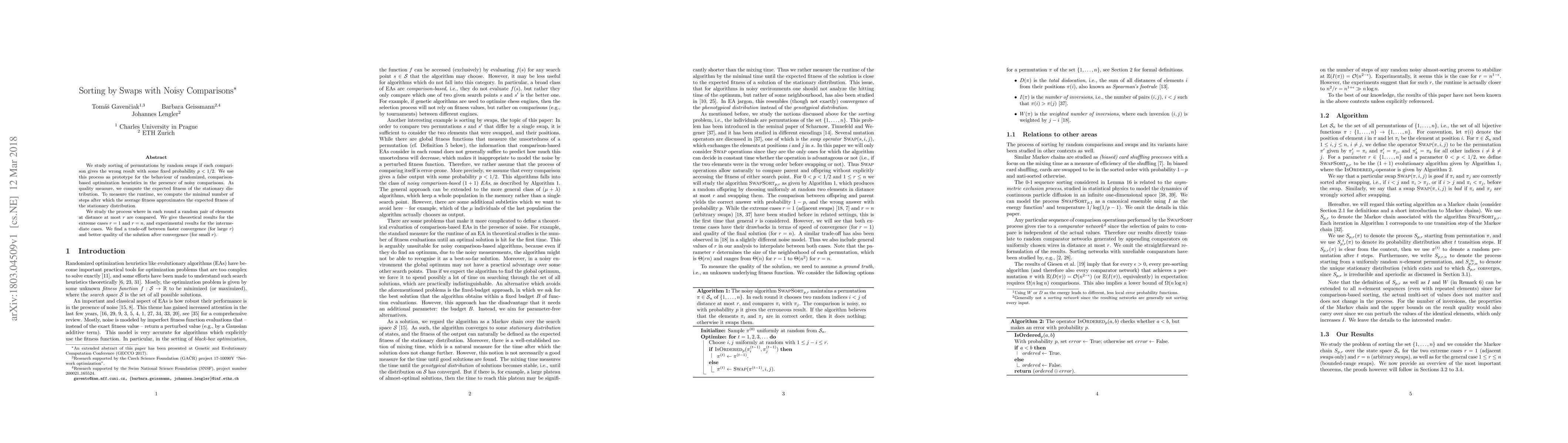 The paper presents a detailed analysis of sorting by swaps with noisy comparisons, identifying a trade-off between convergence speed and solution quality based on the swap distance r.