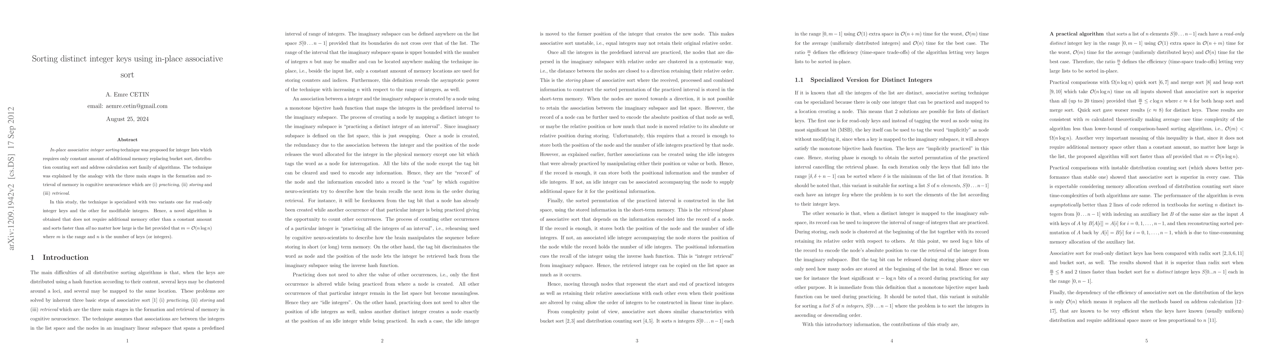 This paper proposes an in-place associative integer sorting technique that sorts lists of distinct integers without additional memory beyond a constant amount, outperforming existing algorithms with a time complexity of O(n logn).