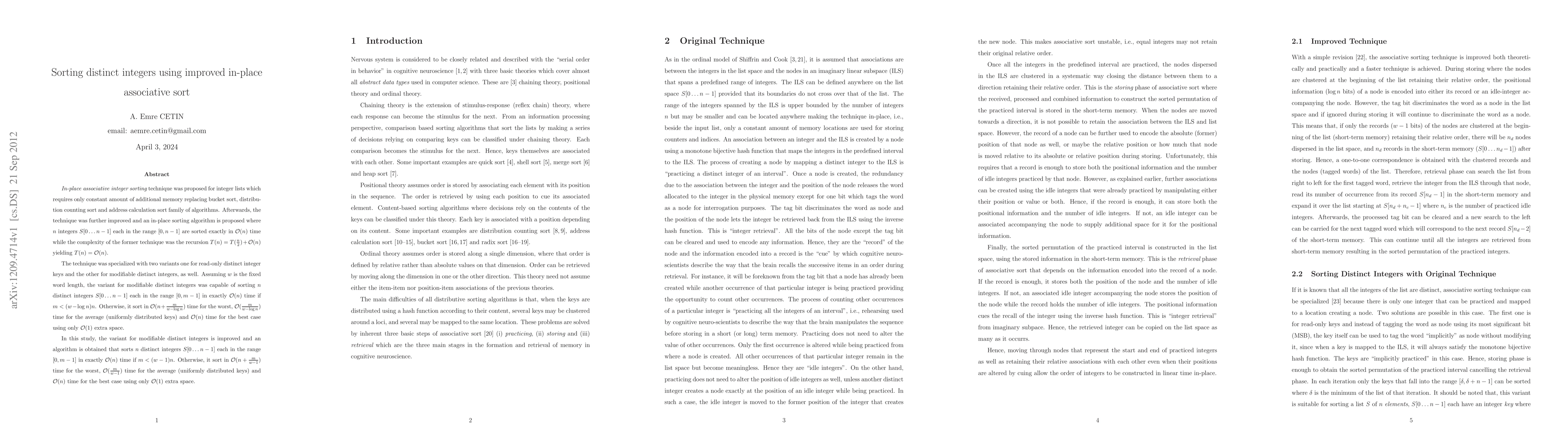 Researchers improved an in-place associative sorting algorithm to sort distinct integers in O(n) time, surpassing previous complexities of T(n) = O(n), with variations for modifiable and read-only keys.
