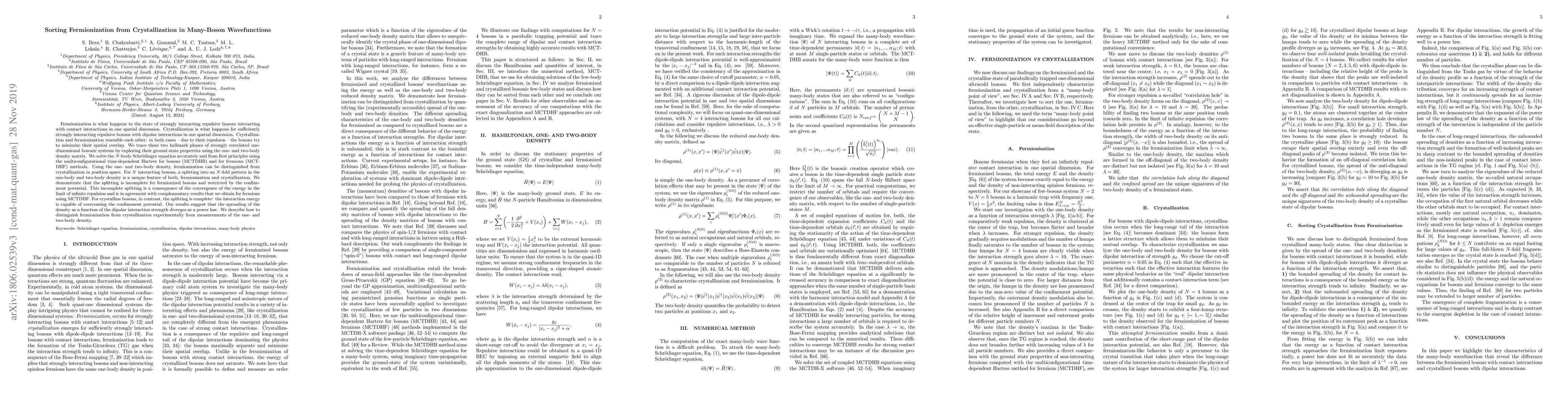 This paper investigates the differences between fermionization and crystallization in strongly interacting one-dimensional bosonic systems, using the MCTDHB method. It finds that while both phenomena involve minimizing spatial overlap, fermionization shows incomplete density splitting due to infinite repulsion limits, whereas crystallization exhibits complete splitting.