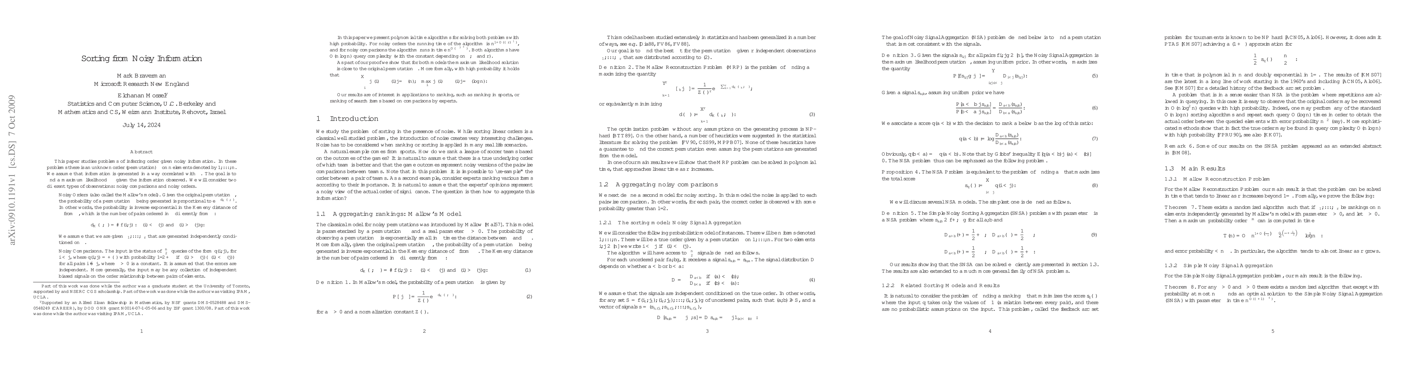 This paper studies problems of inferring order given noisy information. In these problems there is an unknown order (permutation) $\pi$ on $n$ elements denoted by $1,...,n$. We assume that information is generated in a way correlated with $\pi$. The goal is to find a maximum likelihood $\pi^*$ given the information observed. We will consider two different types of observations: noisy comparisons and noisy orders. The data in Noisy orders are permutations given from an exponential distribution correlated with \pi (this is also called the Mallow's model). The data in Noisy Comparisons is a signal given for each pair of elements which is correlated with their true ordering. In this paper we present polynomial time algorithms for solving both problems with high probability. As part of our proof we show that for both models the maximum likelihood solution $\pi^{\ast}$ is close to the original permutation $\pi$. Our results are of interest in applications to ranking, such as ranking in sports, or ranking of search items based on comparisons by experts.