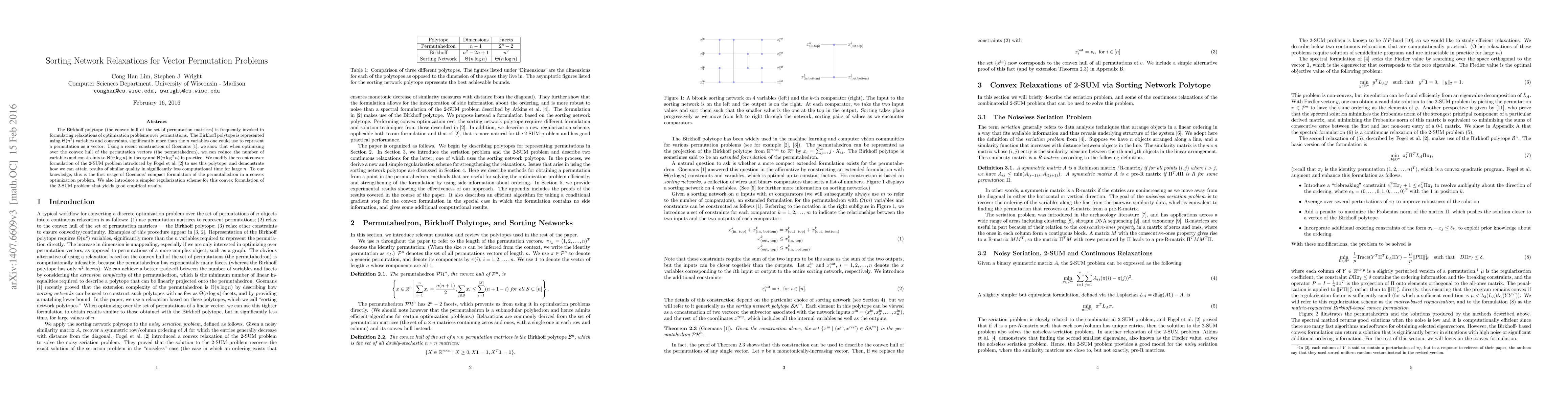 The Birkhoff polytope (the convex hull of the set of permutation matrices) is frequently invoked in formulating relaxations of optimization problems over permutations. The Birkhoff polytope is represented using $\Theta(n^2)$ variables and constraints, significantly more than the $n$ variables one could use to represent a permutation as a vector. Using a recent construction of Goemans (2010), we show that when optimizing over the convex hull of the permutation vectors (the permutahedron), we can reduce the number of variables and constraints to $\Theta(n \log n)$ in theory and $\Theta(n \log^2 n)$ in practice. We modify the recent convex formulation of the 2-SUM problem introduced by Fogel et al. (2013) to use this polytope, and demonstrate how we can attain results of similar quality in significantly less computational time for large $n$. To our knowledge, this is the first usage of Goemans' compact formulation of the permutahedron in a convex optimization problem. We also introduce a simpler regularization scheme for this convex formulation of the 2-SUM problem that yields good empirical results.