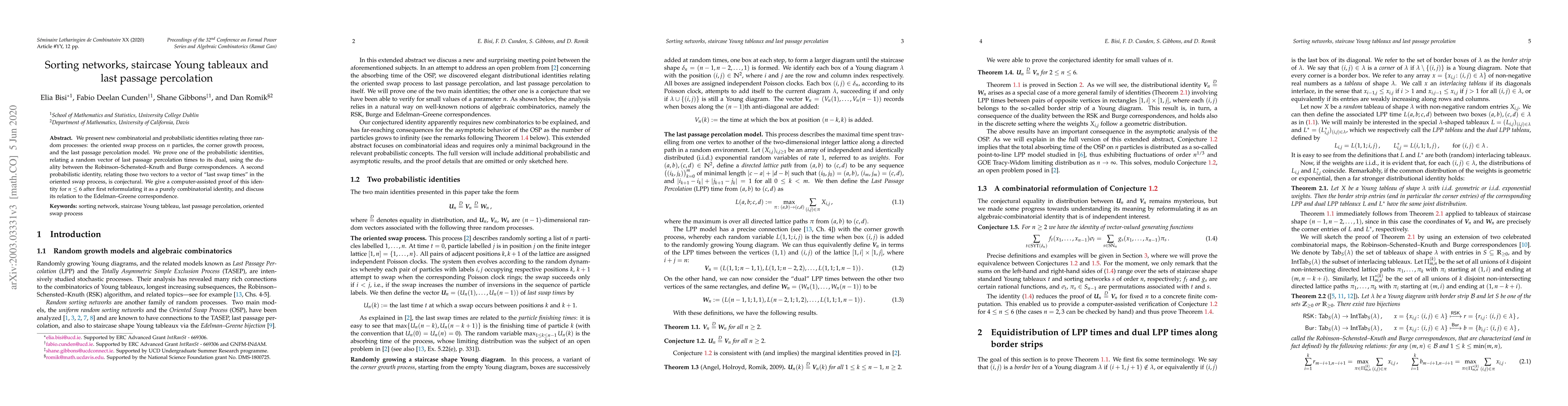 This paper establishes new combinatorial and probabilistic connections between sorting networks, staircase Young tableaux, and last passage percolation, proving a probabilistic identity using the Robinson-Schensted-Knuth correspondence and providing a computer-assisted proof for a conjectured identity up to $n=6$.