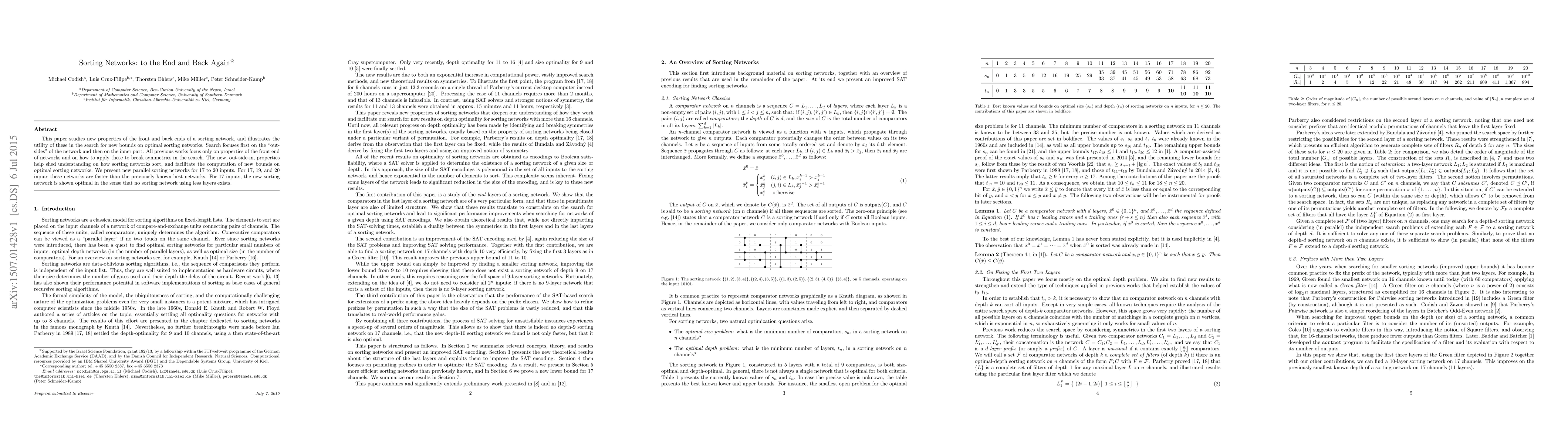 This paper introduces novel properties of both the front and back ends of sorting networks, employing an out-side-in approach to improve the search for optimal sorting networks. It presents new parallel sorting networks for 17 to 20 inputs that outperform previous best networks, with the one for 17 inputs demonstrated to be optimal.
