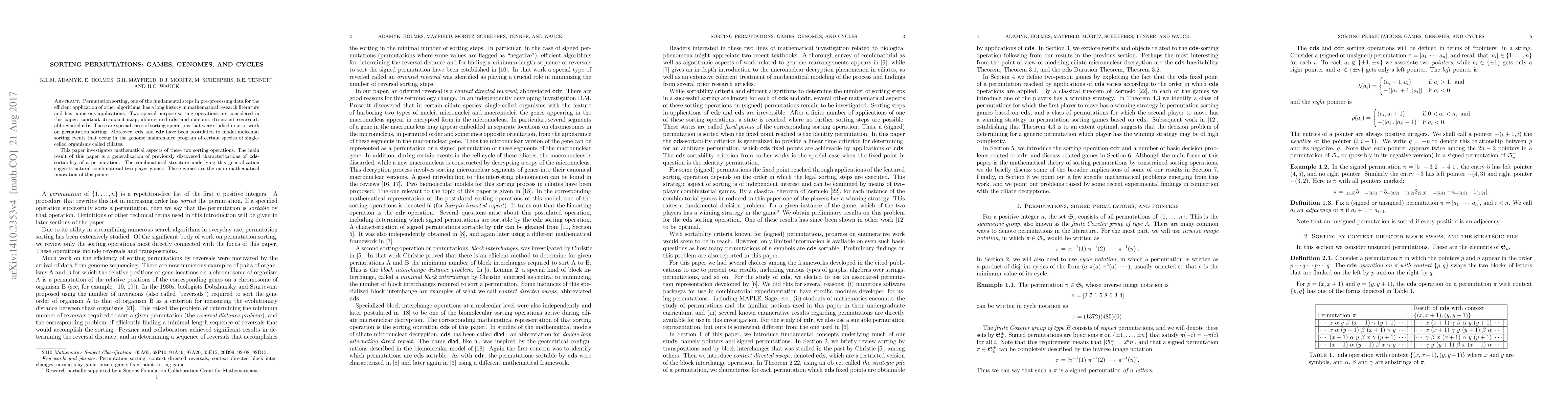 Permutation sorting, one of the fundamental steps in pre-processing data for the efficient application of other algorithms, has a long history in mathematical research literature and has numerous applications. Two special-purpose sorting operations are considered in this paper: context directed swap, abbreviated cds, and context directed reversal, abbreviated cdr. These are special cases of sorting operations that were studied in prior work on permutation sorting. Moreover, cds and cdr have been postulated to model molecular sorting events that occur in the genome maintenance program of certain species of single-celled organisms called ciliates. This paper investigates mathematical aspects of these two sorting operations. The main result of this paper is a generalization of previously discovered characterizations of cds-sortability of a permutation. The combinatorial structure underlying this generalization suggests natural combinatorial two-player games. These games are the main mathematical innovation of this paper.