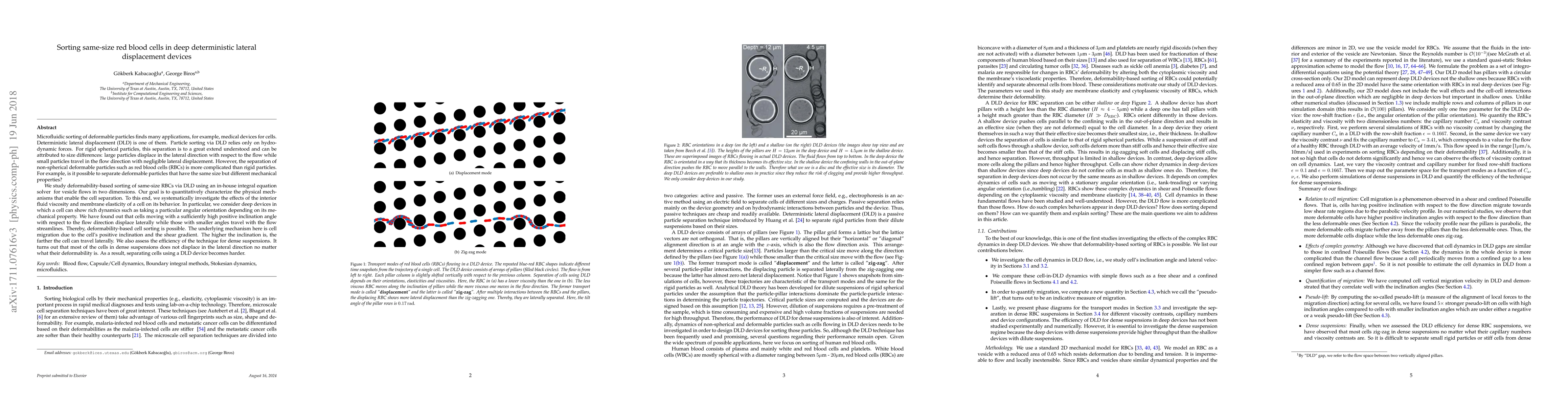 We study deformability-based sorting of same-size RBCs via DLD using an in-house integral equation solver. Our goal is to quantitatively characterize the physical mechanisms that enable the cell separation. To this end, we systematically investigate the effects of the interior fluid viscosity and membrane elasticity of a cell on its behavior. In particular, we consider deep devices in which a cell can show rich dynamics such as taking a particular angular orientation depending on its mechanical property. We have found out that cells moving with a sufficiently high positive inclination angle with respect to the flow direction displace laterally while those with smaller angles travel with the flow streamlines. Thereby, deformability-based cell sorting is possible. The underlying mechanism here is cell migration due to the cell's positive inclination and the shear gradient. The higher the inclination is, the farther the cell can travel laterally. We also assess the efficiency of the technique for dense suspensions. It turns out that most of the cells in dense suspensions does not displace in the lateral direction no matter what their deformability is. As a result, separating cells using a DLD device becomes harder.