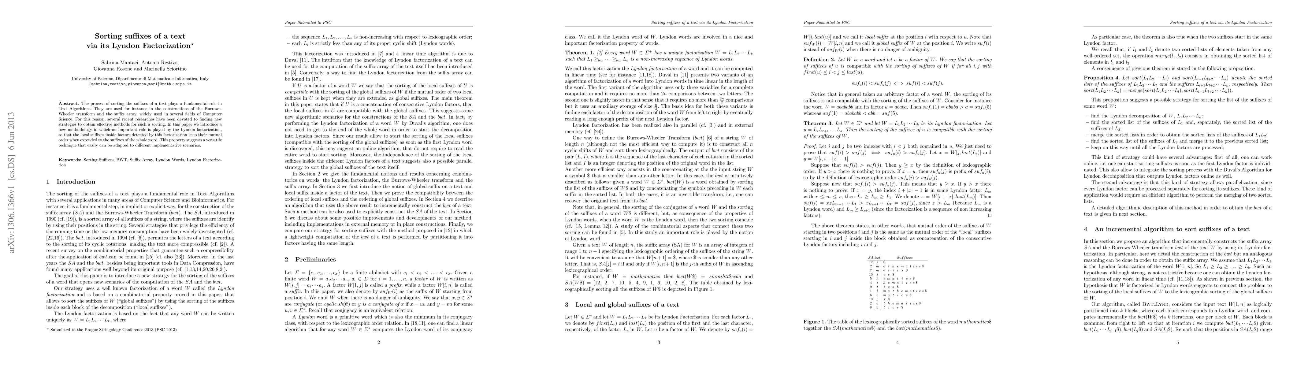 This paper introduces a new methodology for sorting text suffixes using Lyndon factorization, allowing for efficient adaptation to different implementation scenarios.