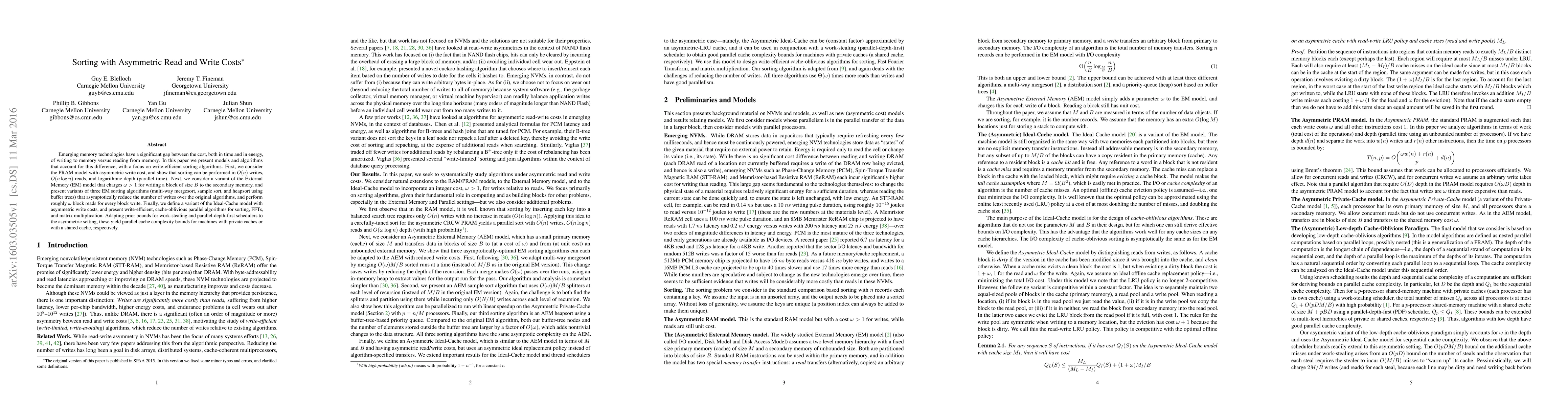 This paper develops models and algorithms for sorting under asymmetric read and write costs, focusing on minimizing write operations. It presents write-efficient sorting algorithms in parallel and external memory models, achieving optimal write counts and reducing write operations compared to traditional methods.