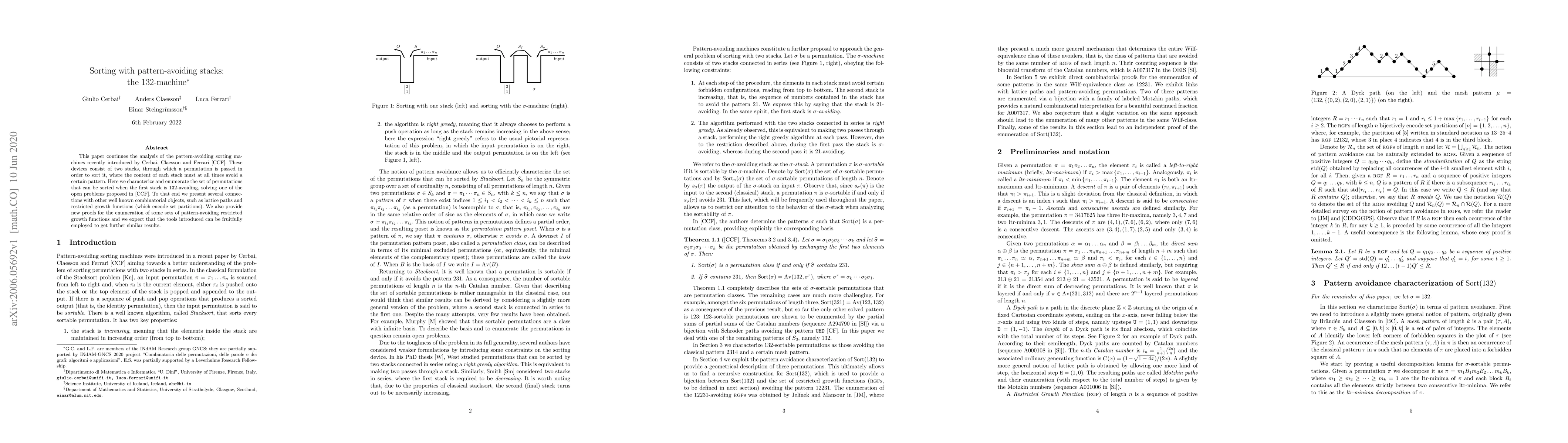 This paper characterizes and enumerates permutations sorted by a $132$-avoiding first stack in pattern-avoiding sorting machines, resolving an open problem. It connects this problem with lattice paths and restricted growth functions, providing new enumerations and promising further combinatorial insights.