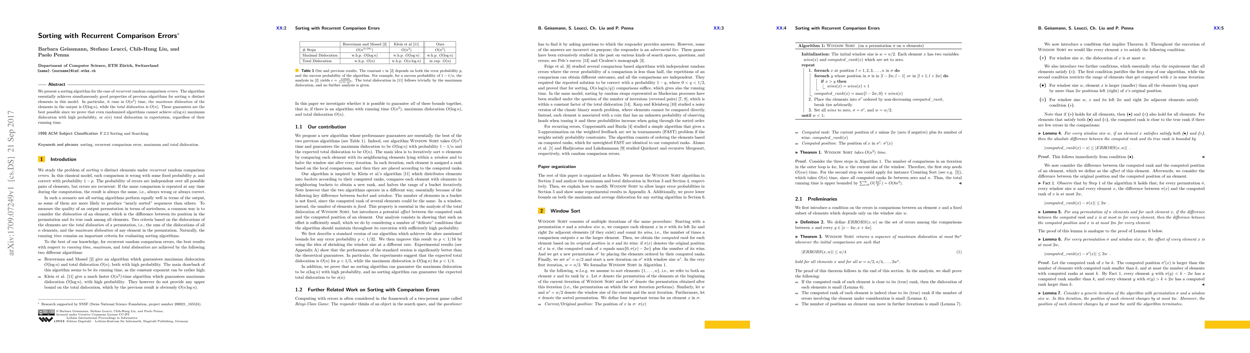 We present a sorting algorithm for the case of recurrent random comparison errors. The algorithm essentially achieves simultaneously good properties of previous algorithms for sorting $n$ distinct elements in this model. In particular, it runs in $O(n^2)$ time, the maximum dislocation of the elements in the output is $O(\log n)$, while the total dislocation is $O(n)$. These guarantees are the best possible since we prove that even randomized algorithms cannot achieve $o(\log n)$ maximum dislocation with high probability, or $o(n)$ total dislocation in expectation, regardless of their running time.