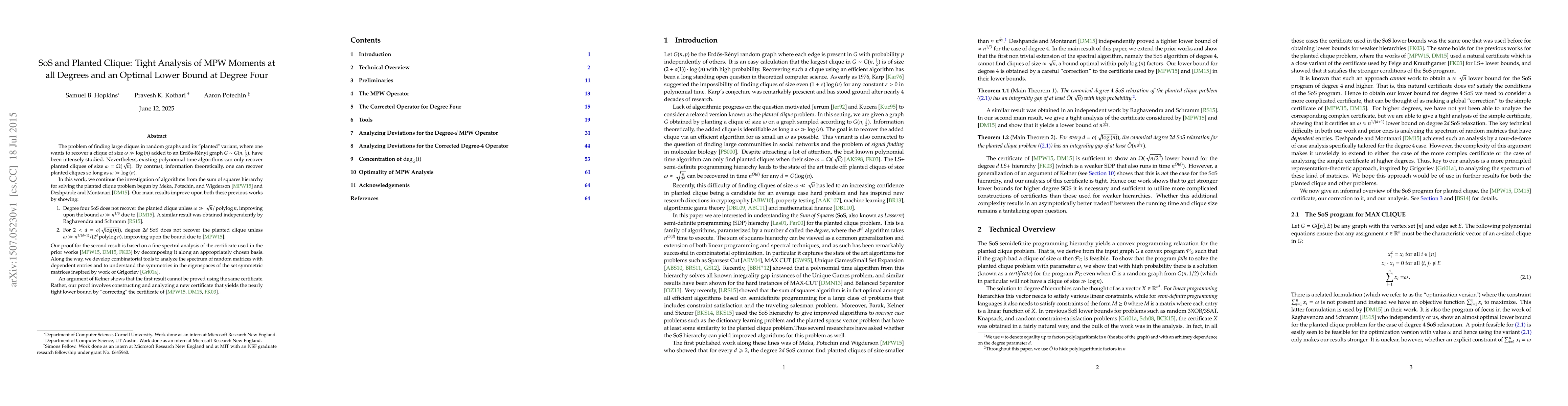 This paper investigates the Sum of Squares (SoS) hierarchy for solving the planted clique problem in random graphs, improving previous bounds on the size of recoverable cliques. It shows that degree four SoS cannot recover planted cliques unless their size is significantly larger than previously thought, and for higher degrees, it provides tighter bounds on the recoverable clique size. The proofs involve novel spectral analysis and combinatorial tools.