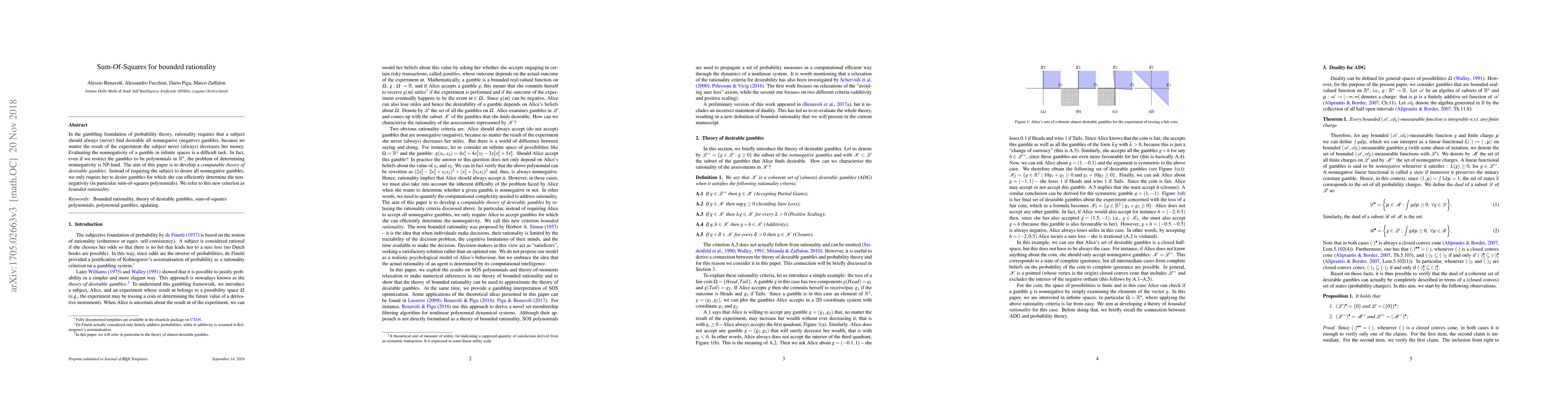In the gambling foundation of probability theory, rationality requires that a subject should always (never) find desirable all nonnegative (negative) gambles, because no matter the result of the experiment the subject never (always) decreases her money. Evaluating the nonnegativity of a gamble in infinite spaces is a difficult task. In fact, even if we restrict the gambles to be polynomials in R^n , the problem of determining nonnegativity is NP-hard. The aim of this paper is to develop a computable theory of desirable gambles. Instead of requiring the subject to accept all nonnegative gambles, we only require her to accept gambles for which she can efficiently determine the nonnegativity (in particular SOS polynomials). We refer to this new criterion as bounded rationality.