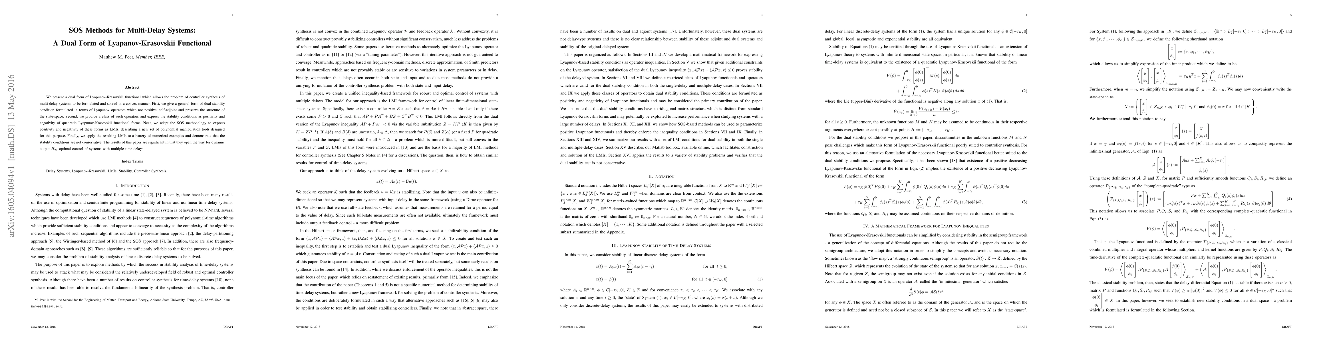 We present a dual form of Lyapunov-Krasovskii functional which allows the problem of controller synthesis of multi-delay systems to be formulated and solved in a convex manner. First, we give a general form of dual stability condition formulated in terms of Lyapunov operators which are positive, self-adjoint and preserve the structure of the state-space. Second, we provide a class of such operators and express the stability conditions as positivity and negativity of quadratic Lyapunov-Krasovskii functional forms. Next, we adapt the SOS methodology to express positivity and negativity of these forms as LMIs, describing a new set of polynomial manipulation tools designed for this purpose. Finally, we apply the resulting LMIs to a battery of numerical examples and demonstrate that the stability conditions are not conservative. The results of this paper are significant in that they open the way for dynamic output H-infinity optimal control of systems with multiple time-delays.