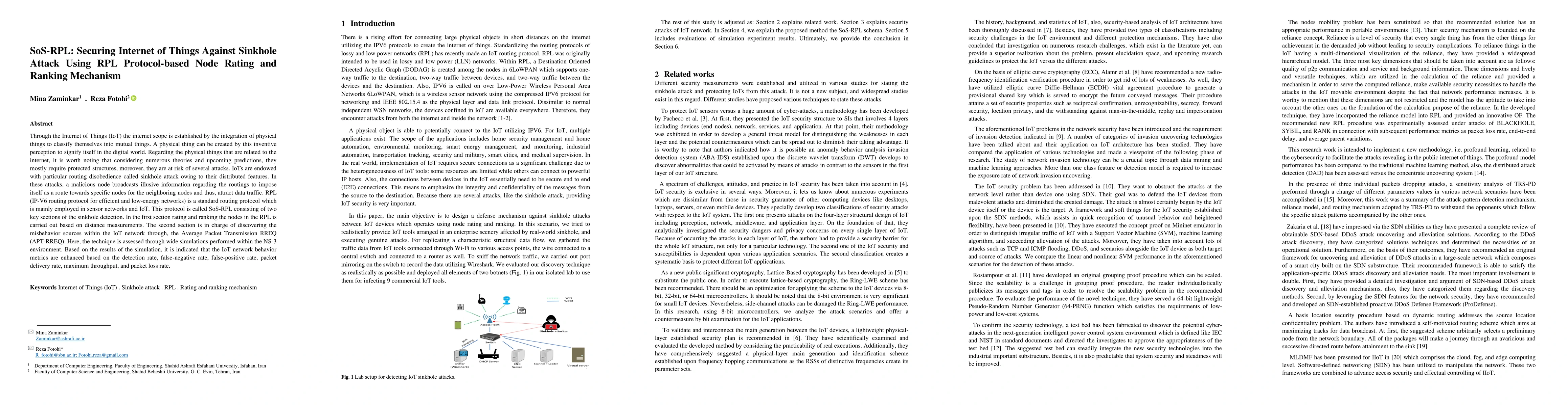 The paper proposes SoS-RPL, a mechanism to secure IoT networks against sinkhole attacks using RPL protocol-based node rating and ranking. It employs distance measurements for node evaluation and APT-RREQ for misbehavior detection, significantly improving network metrics through NS-3 simulations.