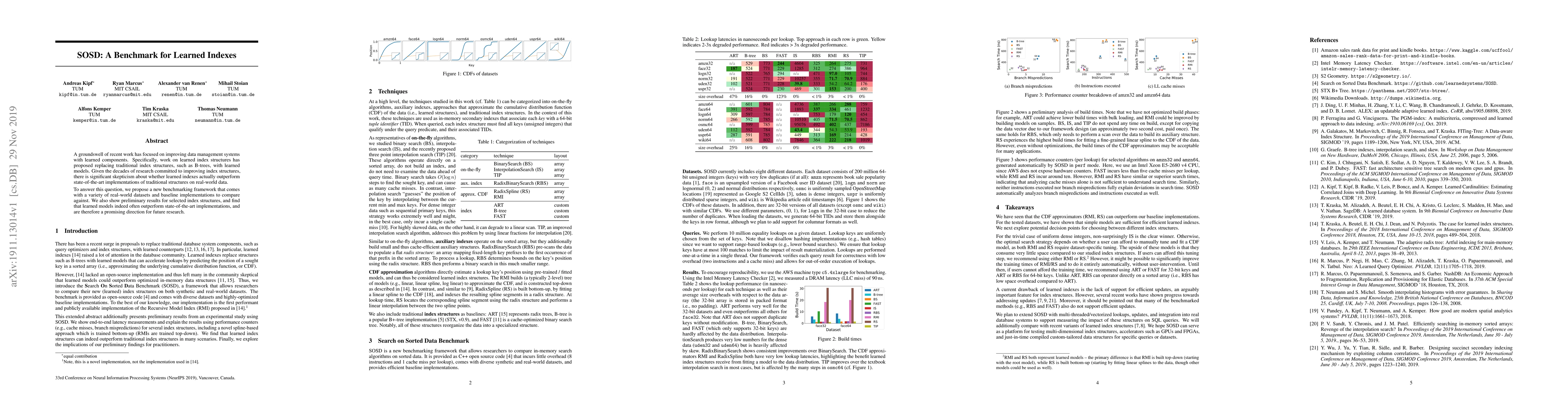 This paper proposes SOSD, a benchmarking framework for evaluating learned index structures against traditional methods using real-world datasets. Preliminary results indicate that learned indexes often outperform state-of-the-art traditional indexes, suggesting a promising direction for future research.