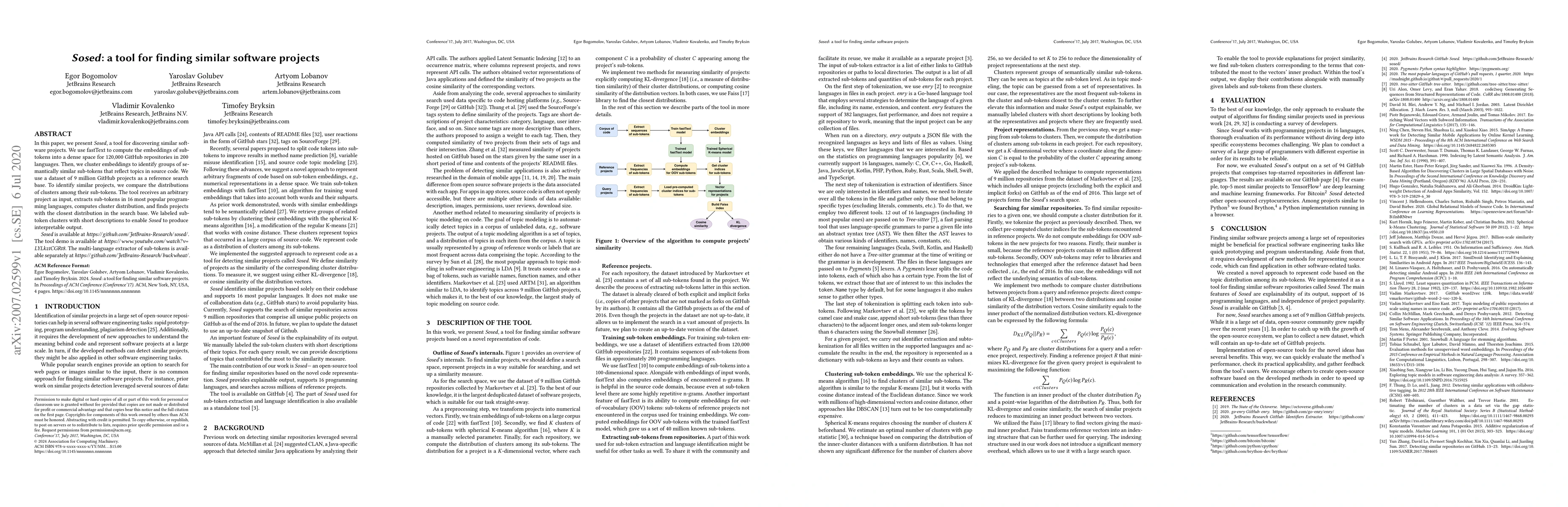 Sosed is a tool that uses fastText embeddings to identify similar software projects by clustering subtokens from 120,000 GitHub repositories in 200 languages. It compares cluster distributions to find projects with semantically similar sub-tokens.