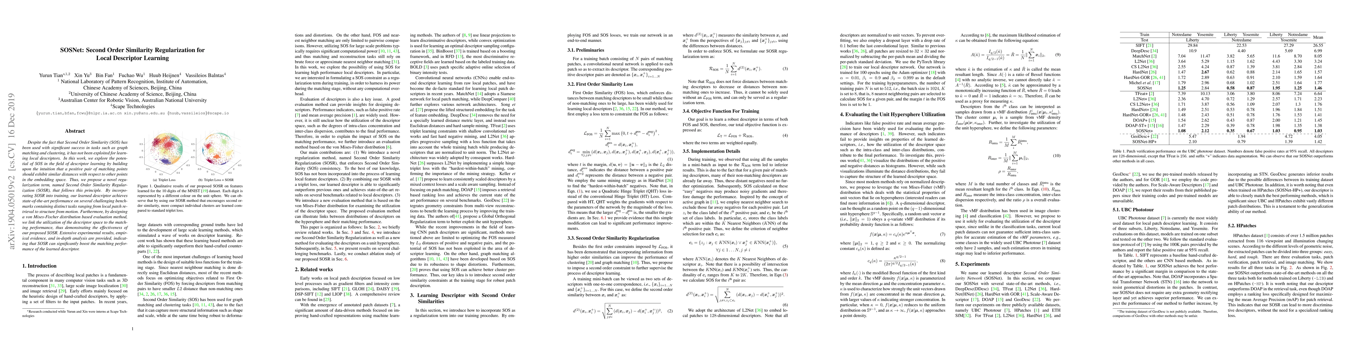 A new regularization technique called Second Order Similarity Regularization (SOSR) is proposed to improve local descriptor learning, achieving state-of-the-art performance on various benchmarks.