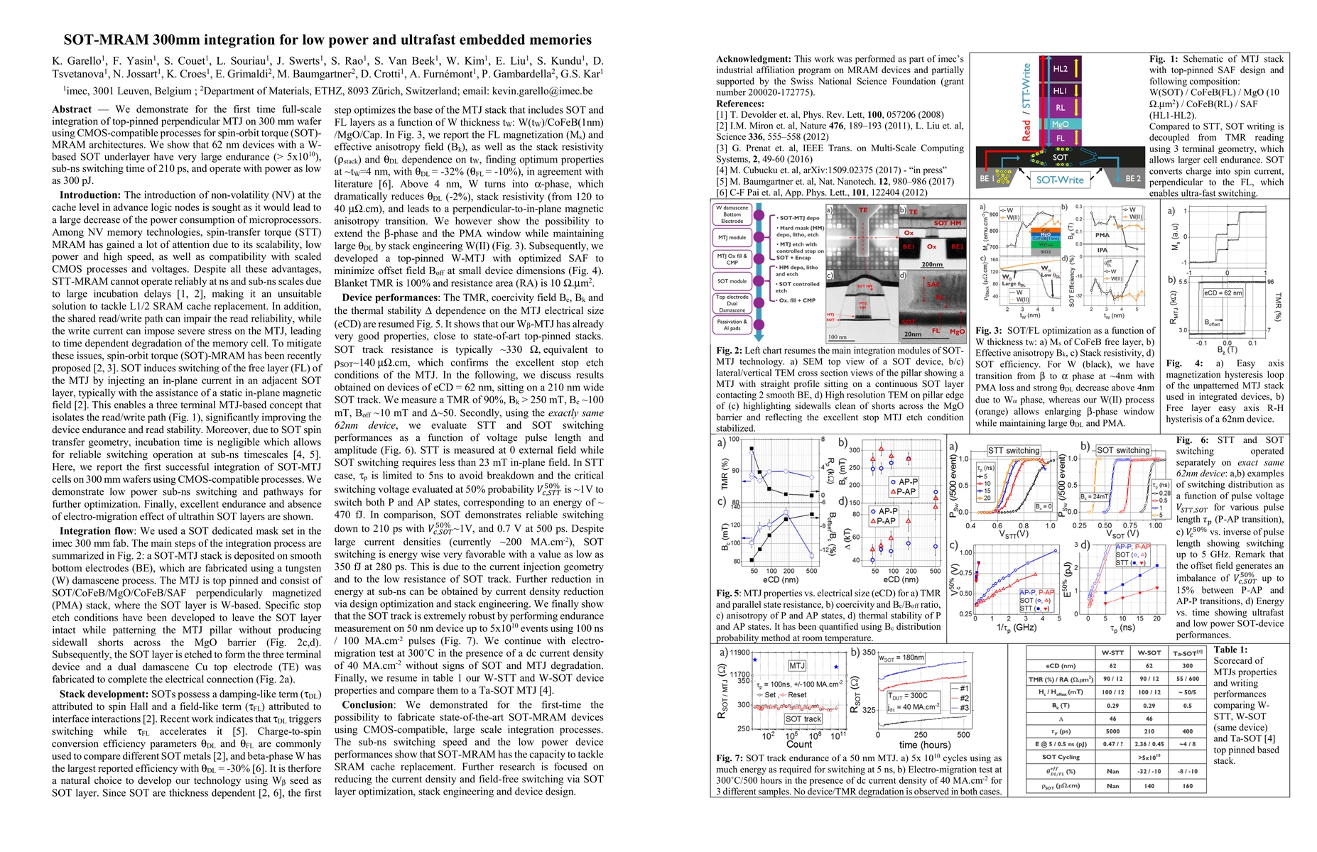 This paper presents the first full-scale integration of 62 nm SOT-MRAM devices on a 300 mm wafer using CMOS-compatible processes, achieving ultrafast switching times of 210 ps, high endurance (> 5x10^10 cycles), and low power operation of 300 pJ.