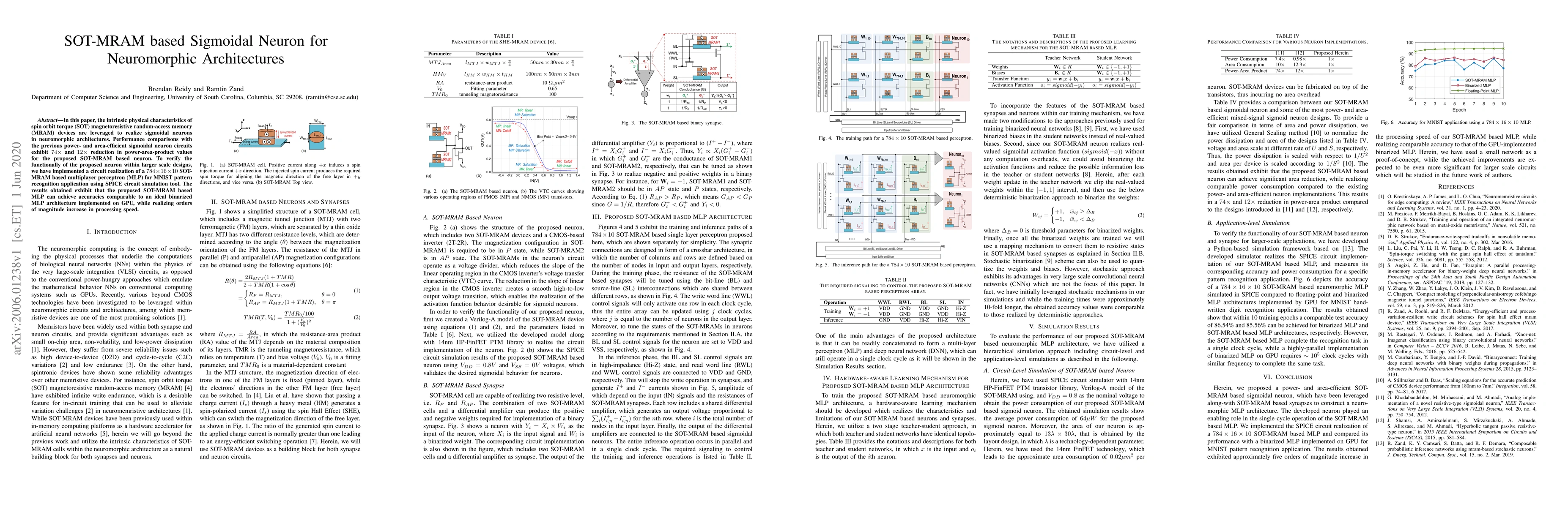 This paper proposes a sigmoidal neuron based on spin-orbit torque magnetoresistive random-access memory (SOT-MRAM) for neuromorphic architectures, demonstrating significant reductions in power-area-product compared to previous circuits. The effectiveness of the proposed neuron is validated through a 784x16x10 SOT-MRAM based MLP for MNIST recognition, achieving high accuracy and processing speed.