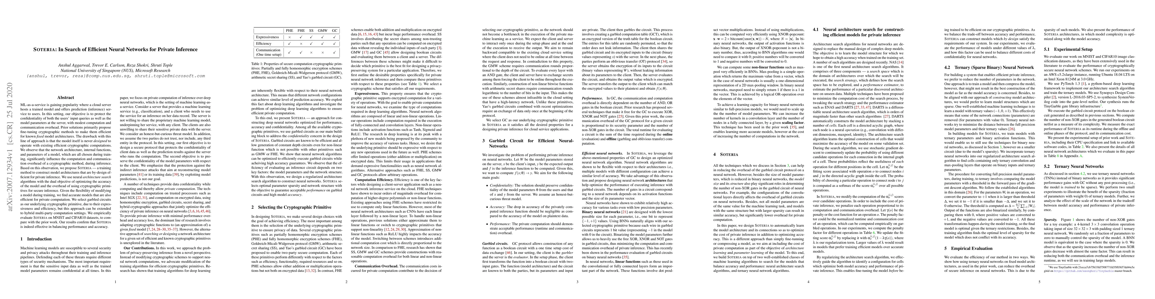 SOTERIA proposes a training method to develop neural networks that are inherently efficient for private inference, optimizing both model accuracy and cryptographic overhead. This approach uses neural architecture search to balance performance and security, demonstrating effectiveness on MNIST and CIFAR10 datasets.