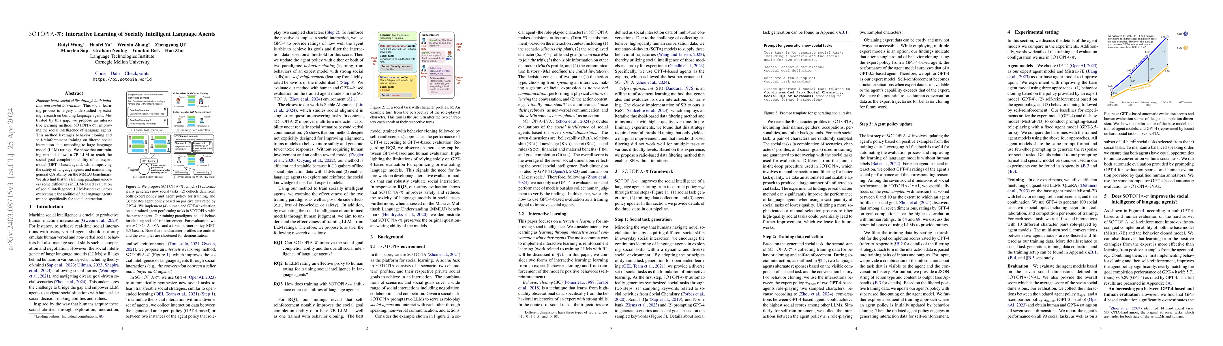 Title: SOTOPIA-$\pi$: Interactive Learning of Socially Intelligent Language Agents Summary: This paper introduces SOTOPIA-$\pi$, a method for improving language agents' social intelligence through interactive learning using behavior cloning and self-reinforcement on filtered social interaction data. The approach enables a 7B LLM to achieve near-expert social goal completion while enhancing safety and general knowledge.