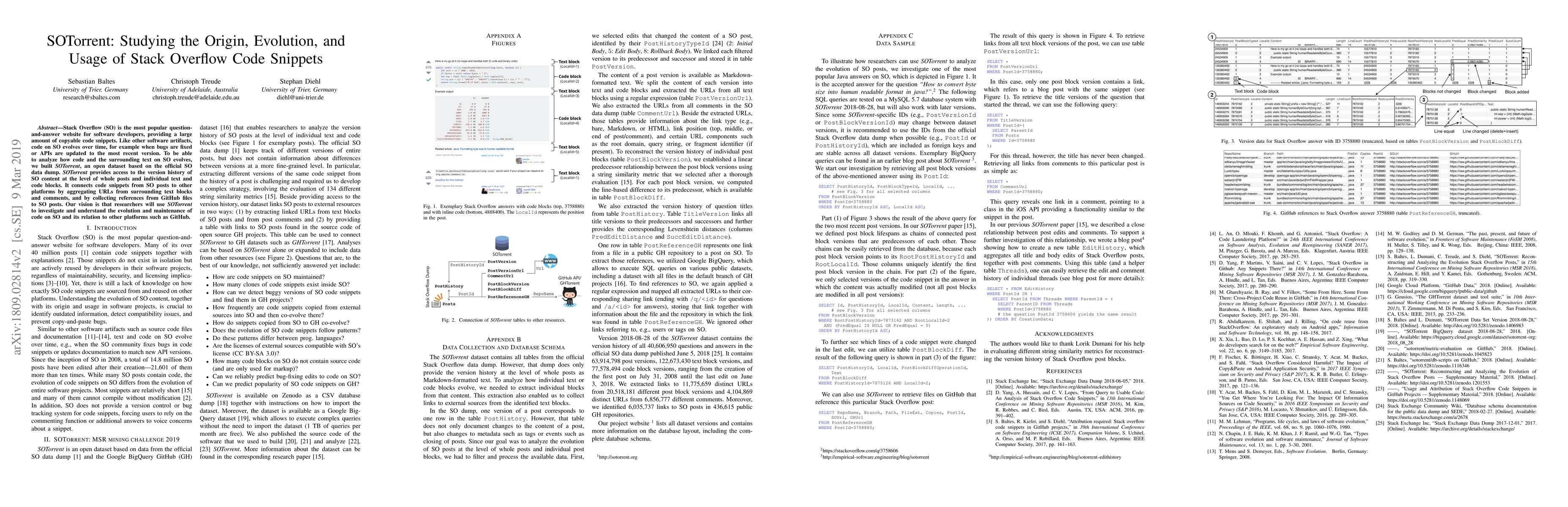 SOTorrent is an open dataset derived from Stack Overflow's data dump, offering detailed version histories of posts and code snippets. It aims to facilitate research on the evolution and maintenance of code on SO and its connections to other platforms like GitHub.