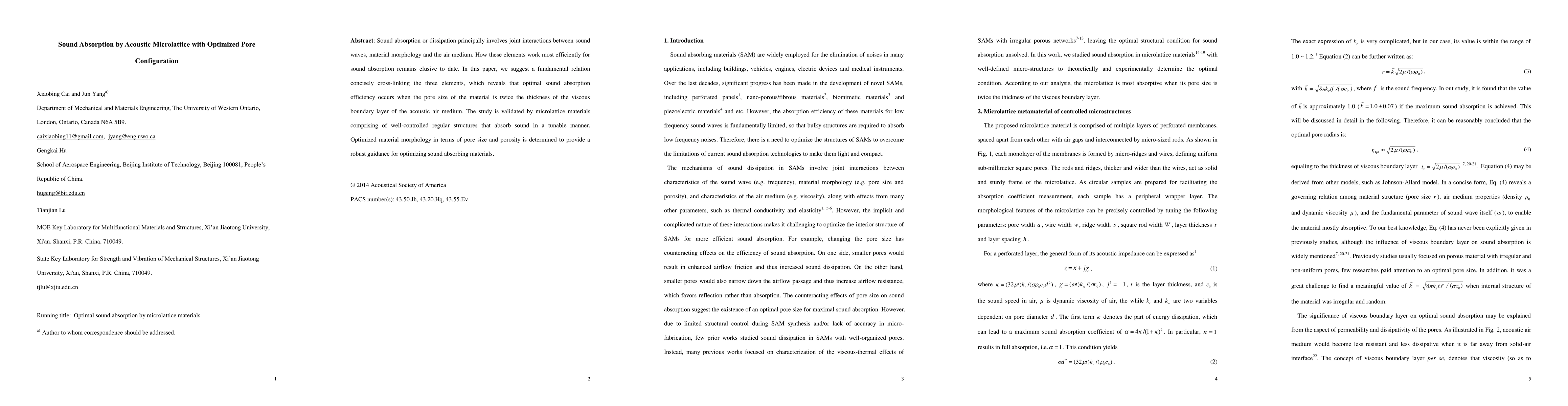 Sound absorption or dissipation principally involves joint interactions between sound waves, material morphology and the air medium. How these elements work most efficiently for sound absorption remains elusive to date. In this paper, we suggest a fundamental relation concisely cross-linking the three elements, which reveals that optimal sound absorption efficiency occurs when the pore size of the material is twice the thickness of the viscous boundary layer of the acoustic air medium. The study is validated by microlattice materials comprising of well-controlled regular structures that absorb sound in a tunable manner. Optimized material morphology in terms of pore size and porosity is determined to provide a robust guidance for optimizing sound absorbing materials.