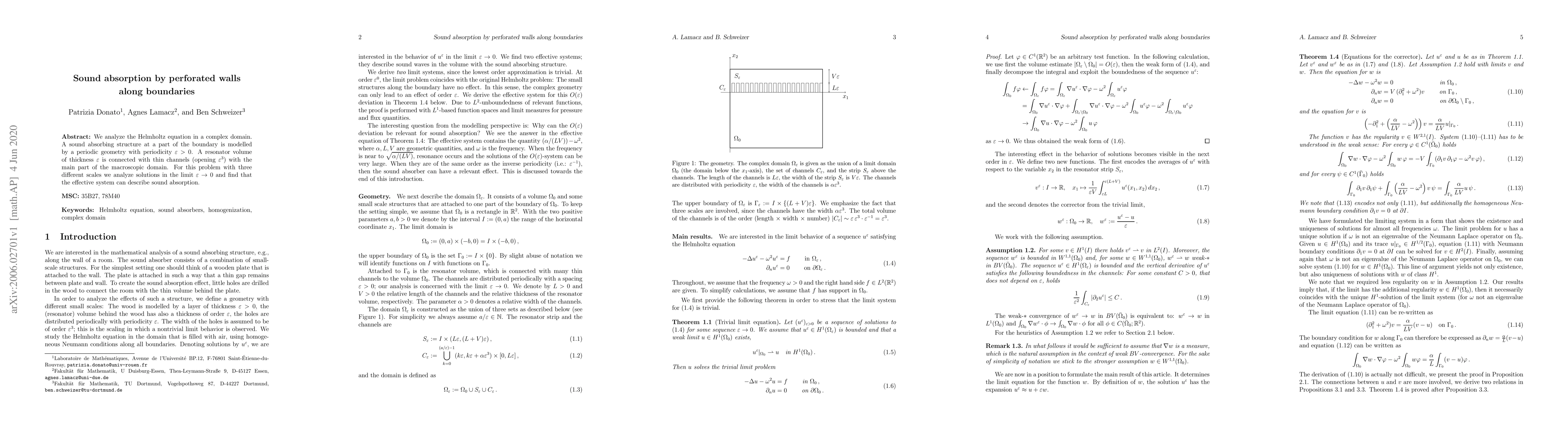 We analyze the Helmholtz equation in a complex domain. A sound absorbing structure at a part of the boundary is modelled by a periodic geometry with periodicity $\varepsilon>0$. A resonator volume of thickness $\varepsilon$ is connected with thin channels (opening $\varepsilon^3$) with the main part of the macroscopic domain. For this problem with three different scales we analyze solutions in the limit $\varepsilon\to 0$ and find that the effective system can describe sound absorption.
