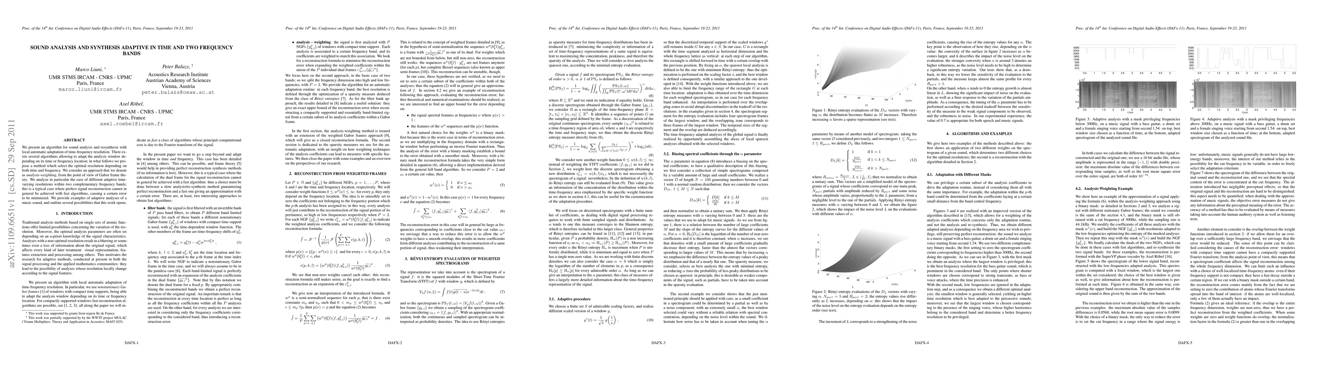 We present an algorithm for sound analysis and resynthesis with local automatic adaptation of time-frequency resolution. There exists several algorithms allowing to adapt the analysis window depending on its time or frequency location; in what follows we propose a method which select the optimal resolution depending on both time and frequency. We consider an approach that we denote as analysis-weighting, from the point of view of Gabor frame theory. We analyze in particular the case of different adaptive time-varying resolutions within two complementary frequency bands; this is a typical case where perfect signal reconstruction cannot in general be achieved with fast algorithms, causing a certain error to be minimized. We provide examples of adaptive analyses of a music sound, and outline several possibilities that this work opens.