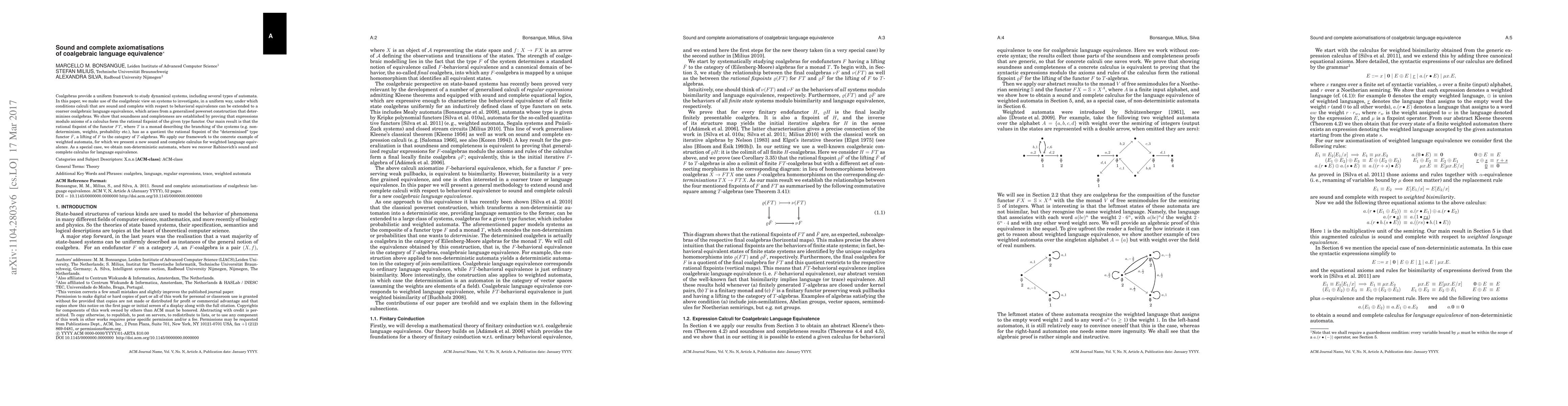 Coalgebras provide a uniform framework to study dynamical systems, including several types of automata. In this paper, we make use of the coalgebraic view on systems to investigate, in a uniform way, under which conditions calculi that are sound and complete with respect to behavioral equivalence can be extended to a coarser coalgebraic language equivalence, which arises from a generalised powerset construction that determinises coalgebras. We show that soundness and completeness are established by proving that expressions modulo axioms of a calculus form the rational fixpoint of the given type functor. Our main result is that the rational fixpoint of the functor $FT$, where $T$ is a monad describing the branching of the systems (e.g. non-determinism, weights, probability etc.), has as a quotient the rational fixpoint of the "determinised" type functor $\bar F$, a lifting of $F$ to the category of $T$-algebras. We apply our framework to the concrete example of weighted automata, for which we present a new sound and complete calculus for weighted language equivalence. As a special case, we obtain non-deterministic automata, where we recover Rabinovich's sound and complete calculus for language equivalence.