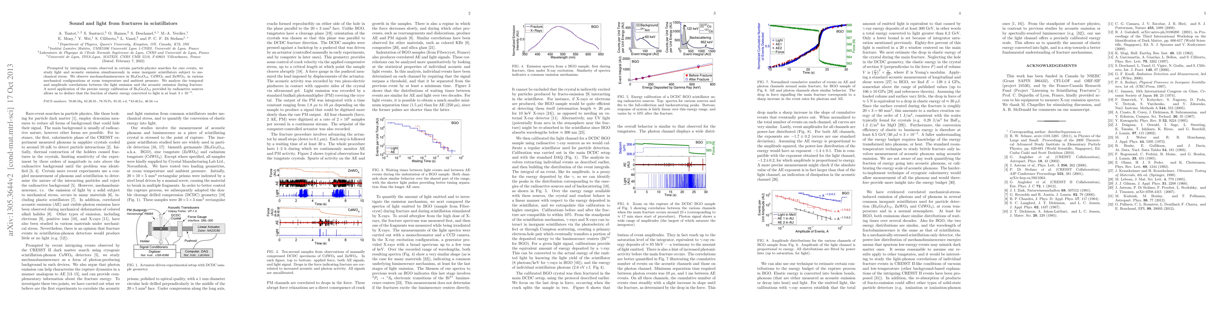 Prompted by intriguing events observed in certain particle-physics searches for rare events, we study light and acoustic emission simultaneously in some inorganic scintillators subject to mechanical stress. We observe mechanoluminescence in ${Bi}_4{Ge}_{3}{O}_{12}$, ${CdWO}_{4}$ and ${ZnWO}_{4}$, in various mechanical configurations at room temperature and ambient pressure. We analyze how the light emission is correlated to acoustic emission during fracture. For ${Bi}_4{Ge}_{3}{O}_{12}$, we set a lower bound on the energy of the emitted light, and deduce that the fraction of elastic energy converted to light is at least $3 \times 10^{-5}$.