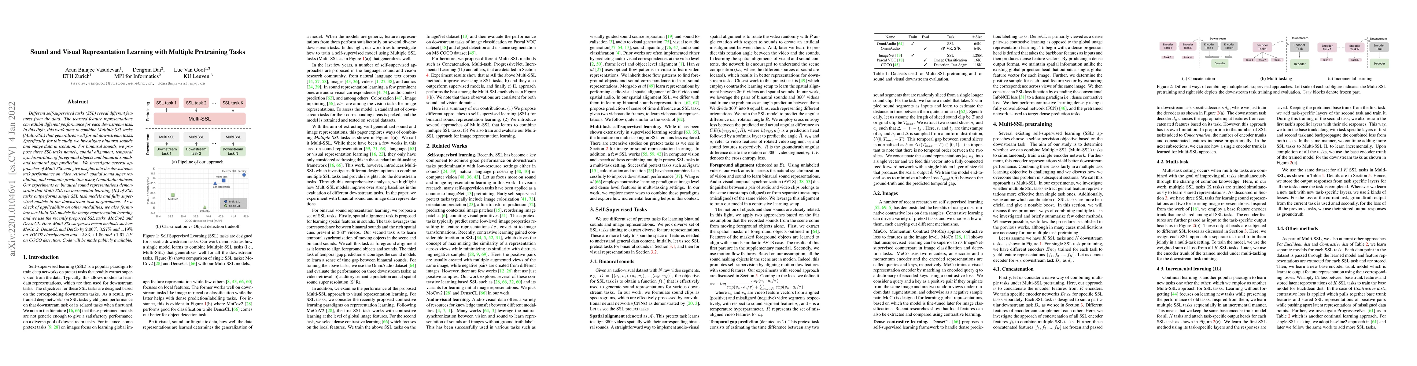 This research introduces Multi-SSL, a method that combines multiple self-supervised learning tasks for better feature representation in binaural sounds and images. Experiments on binaural sounds show Multi-SSL outperforms single SSL tasks and fully supervised models in downstream tasks like video retrieval and sound super-resolution. For images, Multi-SSL surpasses recent methods on classification and detection tasks.
