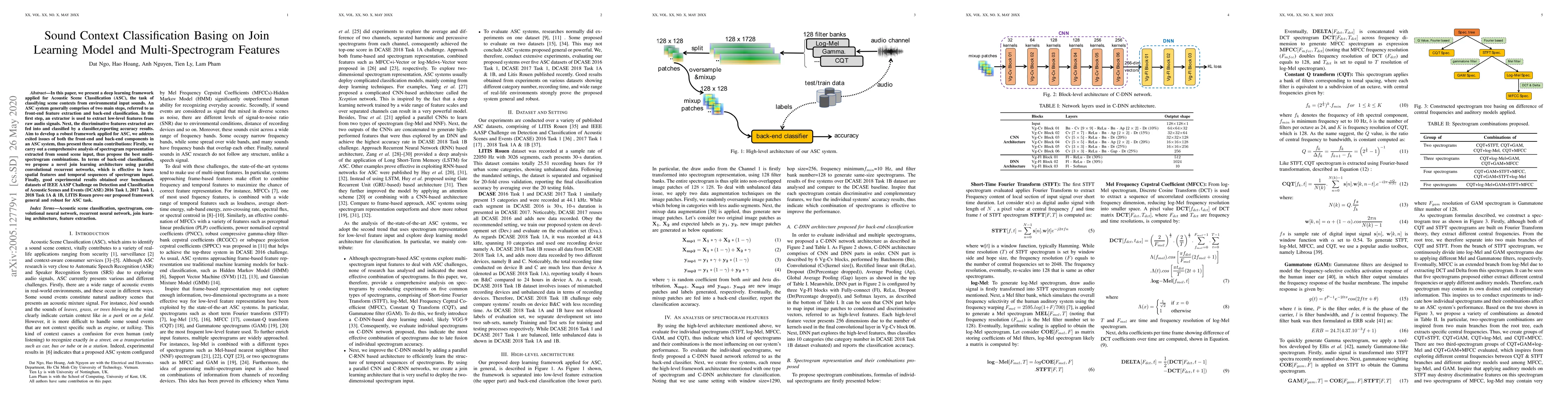 In this paper, we present a deep learning framework applied for Acoustic Scene Classification (ASC), the task of classifying scene contexts from environmental input sounds. An ASC system generally comprises of two main steps, referred to as front-end feature extraction and back-end classification. In the first step, an extractor is used to extract low-level features from raw audio signals. Next, the discriminative features extracted are fed into and classified by a classifier, reporting accuracy results. Aim to develop a robust framework applied for ASC, we address exited issues of both the front-end and back-end components in an ASC system, thus present three main contributions: Firstly, we carry out a comprehensive analysis of spectrogram representation extracted from sound scene input, thus propose the best multi-spectrogram combinations. In terms of back-end classification, we propose a novel join learning architecture using parallel convolutional recurrent networks, which is effective to learn spatial features and temporal sequences of spectrogram input. Finally, good experimental results obtained over benchmark datasets of IEEE AASP Challenge on Detection and Classification of Acoustic Scenes and Events (DCASE) 2016 Task 1, 2017 Task 1, 2018 Task 1A & 1B, LITIS Rouen prove our proposed framework general and robust for ASC task.