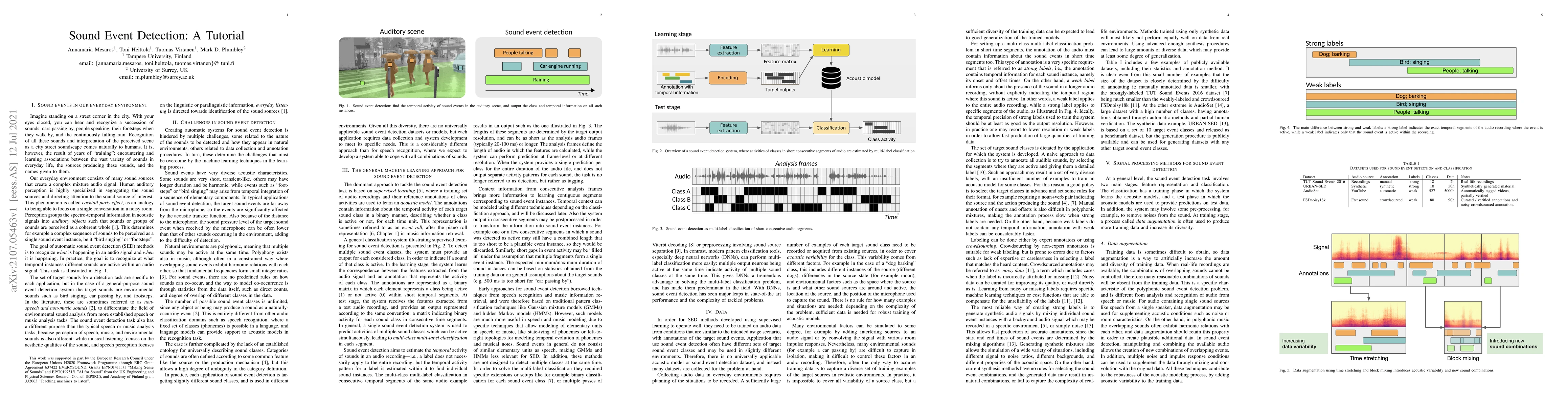 This paper provides a comprehensive tutorial on automatic sound event detection (SED), explaining its definition, various signal processing and machine learning techniques, evaluation methods, and future research directions. It aims to recognize temporal instances of different sounds within an audio signal.