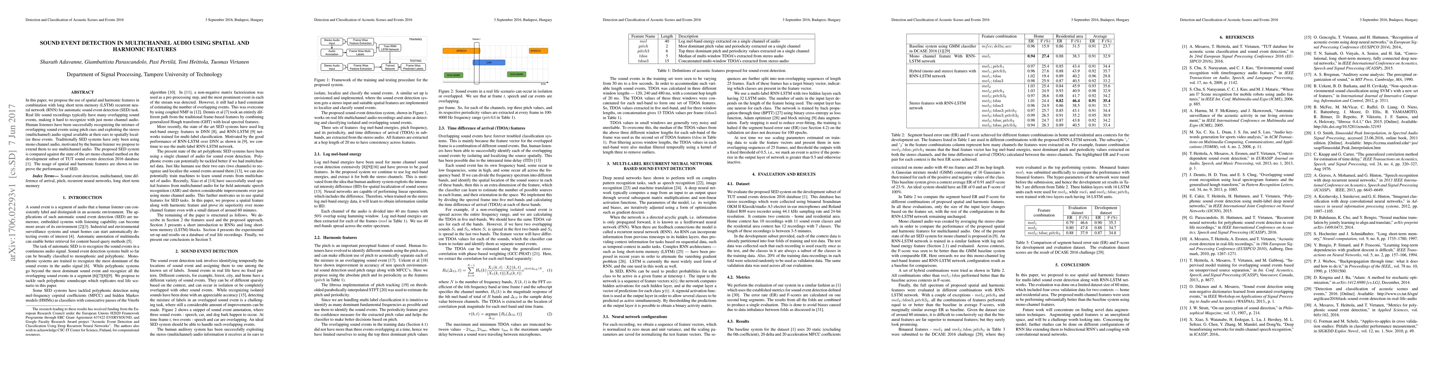 This paper proposes an automatic sound event detection system using spatial and harmonic features combined with LSTM RNNs, leveraging multichannel audio to enhance recognition of overlapping sound events. The method outperforms traditional mono channel approaches, as demonstrated on the TUT sound events detection 2016 database.