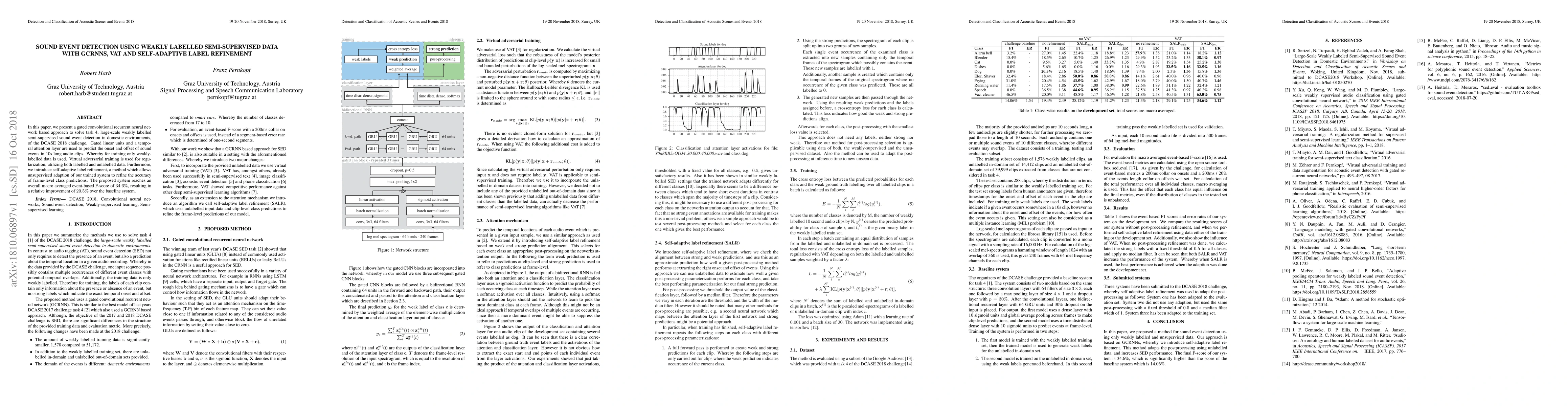In this paper, we present a gated convolutional recurrent neural network based approach to solve task 4, large-scale weakly labelled semi-supervised sound event detection in domestic environments, of the DCASE 2018 challenge. Gated linear units and a temporal attention layer are used to predict the onset and offset of sound events in 10s long audio clips. Whereby for training only weakly-labelled data is used. Virtual adversarial training is used for regularization, utilizing both labelled and unlabeled data. Furthermore, we introduce self-adaptive label refinement, a method which allows unsupervised adaption of our trained system to refine the accuracy of frame-level class predictions. The proposed system reaches an overall macro averaged event-based F-score of 34.6%, resulting in a relative improvement of 20.5% over the baseline system.