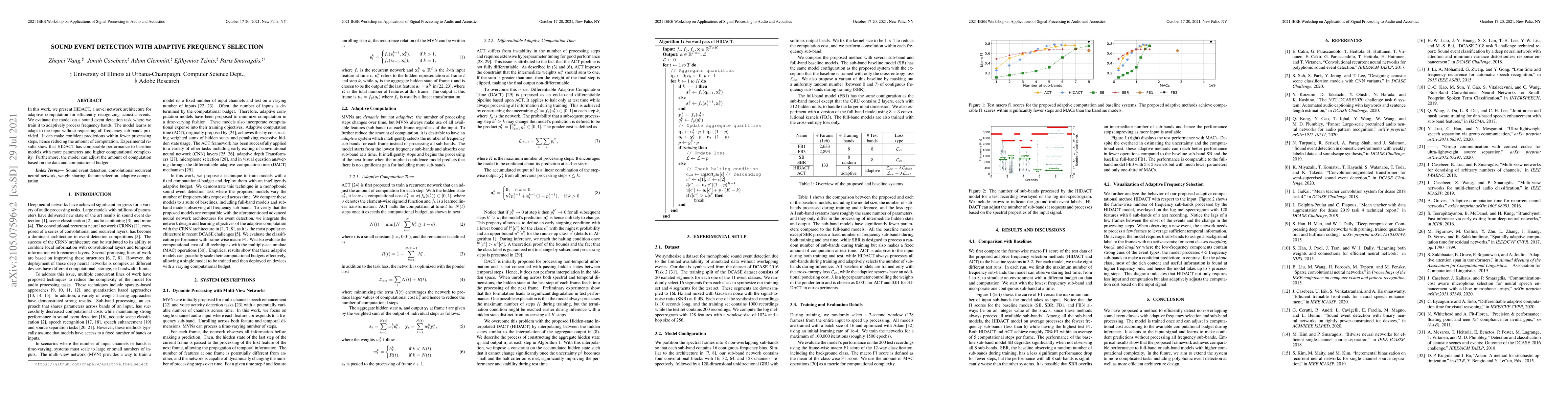 In this work, we present HIDACT, a novel network architecture for adaptive computation for efficiently recognizing acoustic events. We evaluate the model on a sound event detection task where we train it to adaptively process frequency bands. The model learns to adapt to the input without requesting all frequency sub-bands provided. It can make confident predictions within fewer processing steps, hence reducing the amount of computation. Experimental results show that HIDACT has comparable performance to baseline models with more parameters and higher computational complexity. Furthermore, the model can adjust the amount of computation based on the data and computational budget.